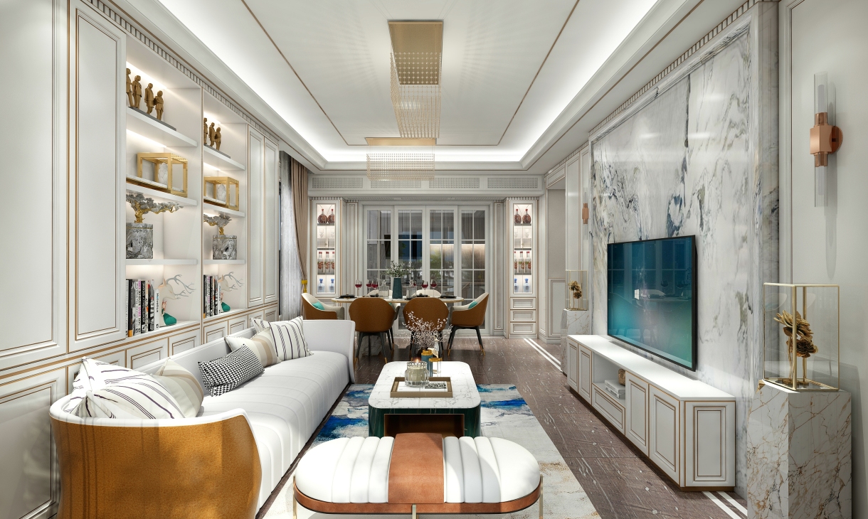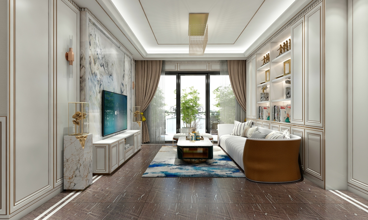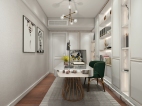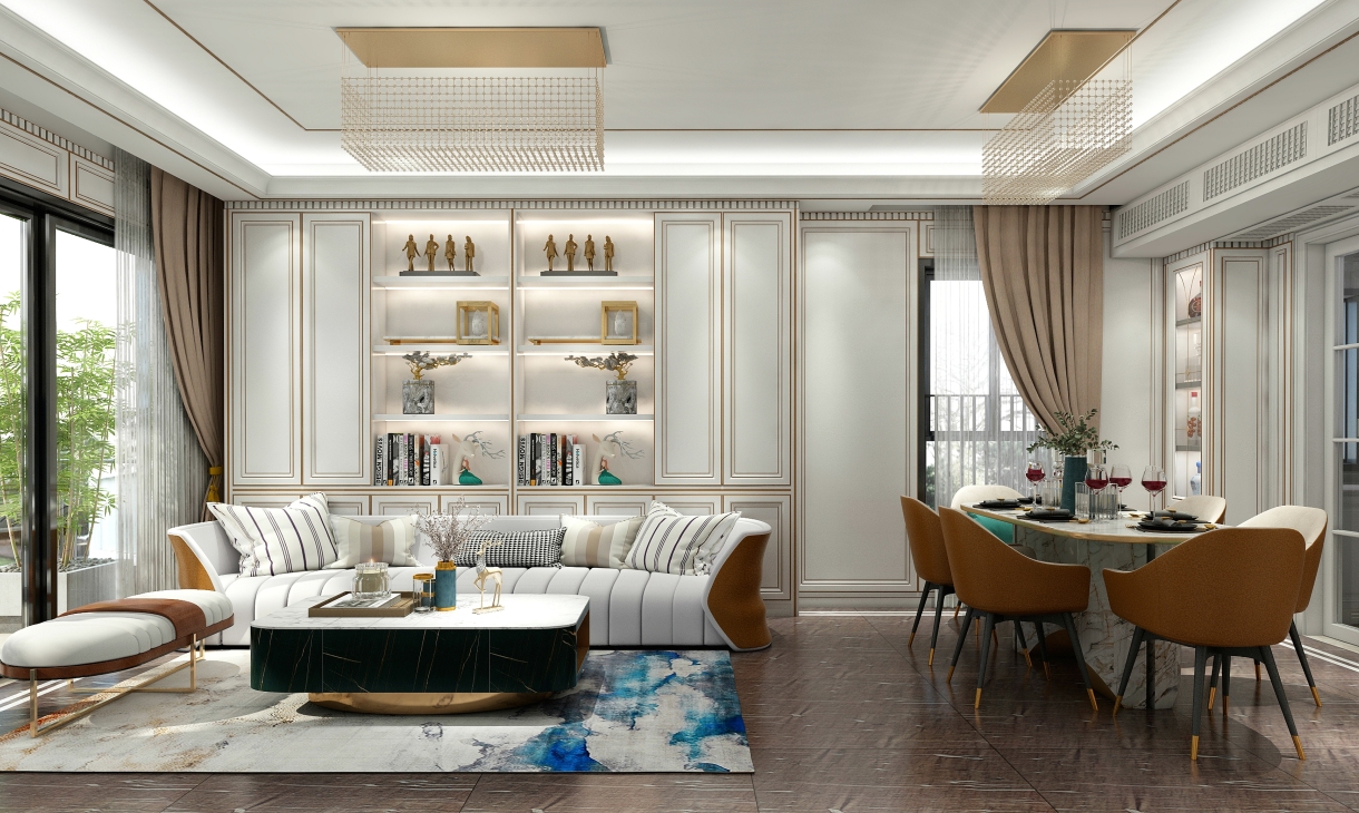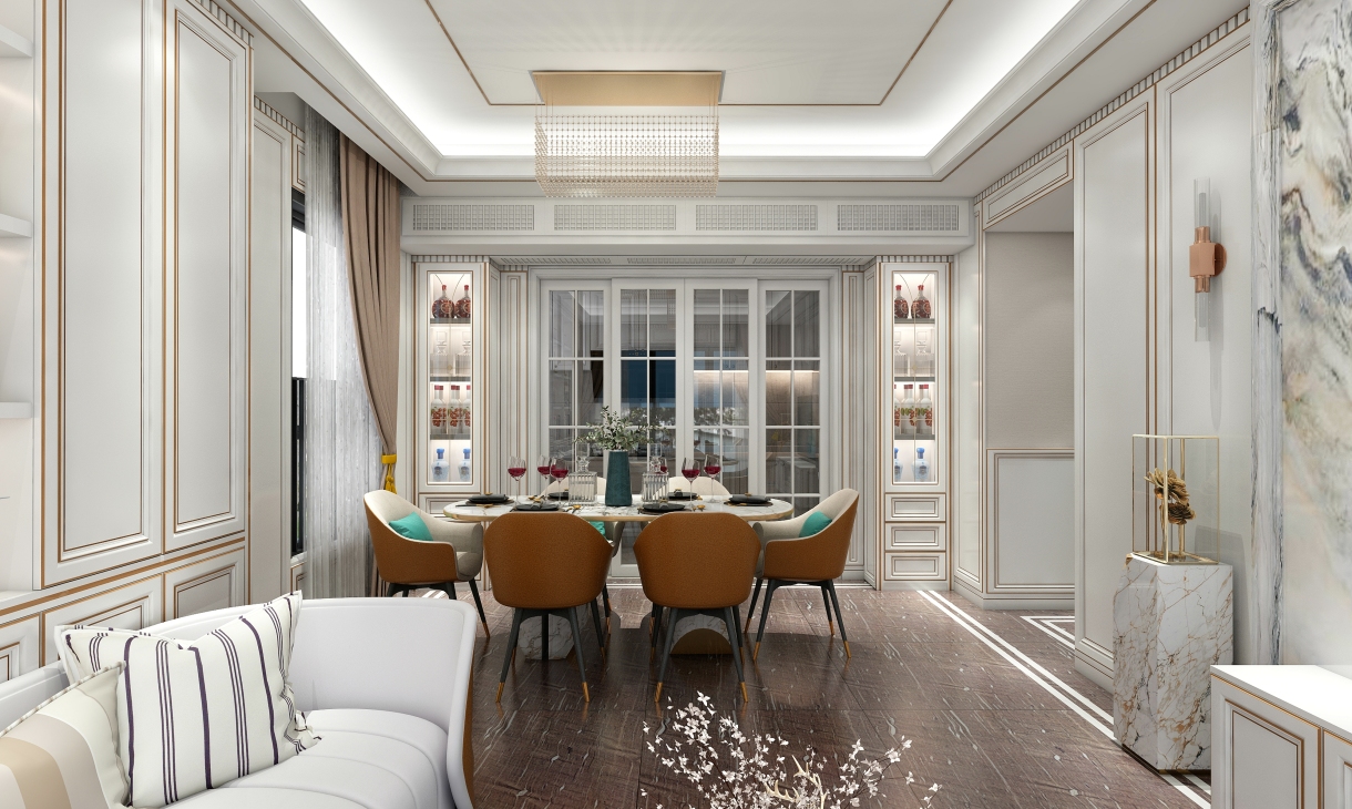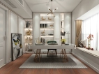 利用對稱的柜體設(shè)計配合壁爐形成空間的主墻體,滿足了展示和儲物功能的同時顯得空間古典大氣。