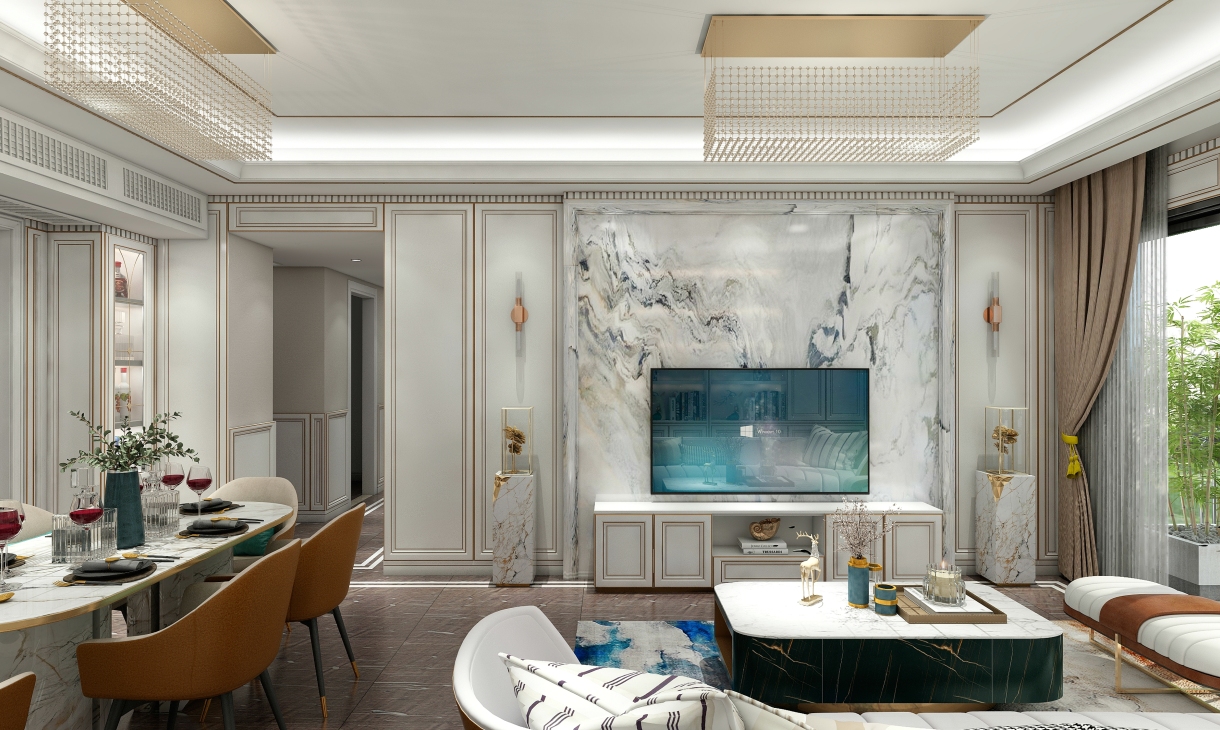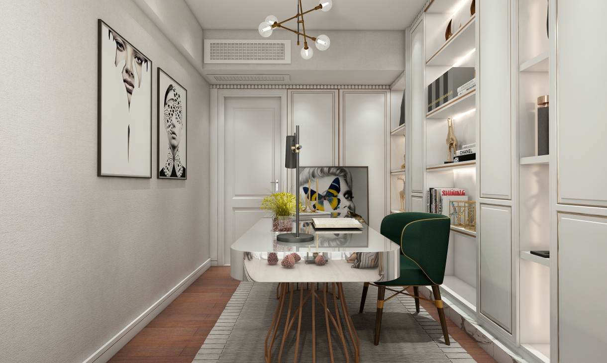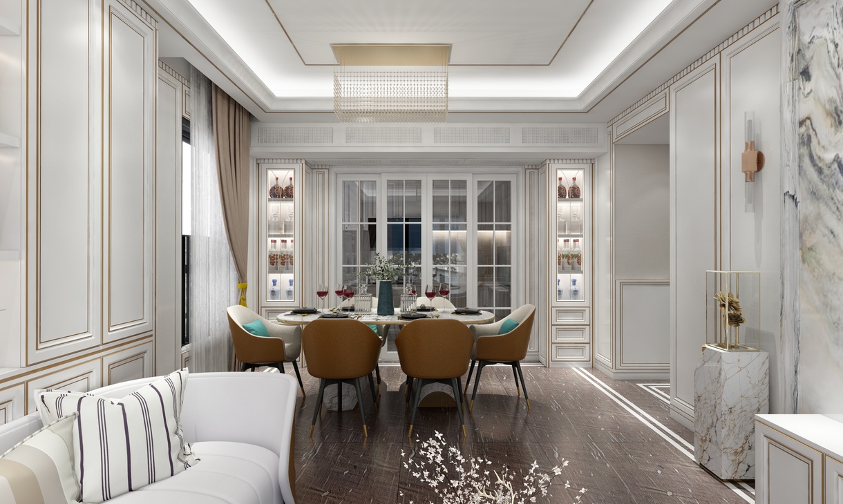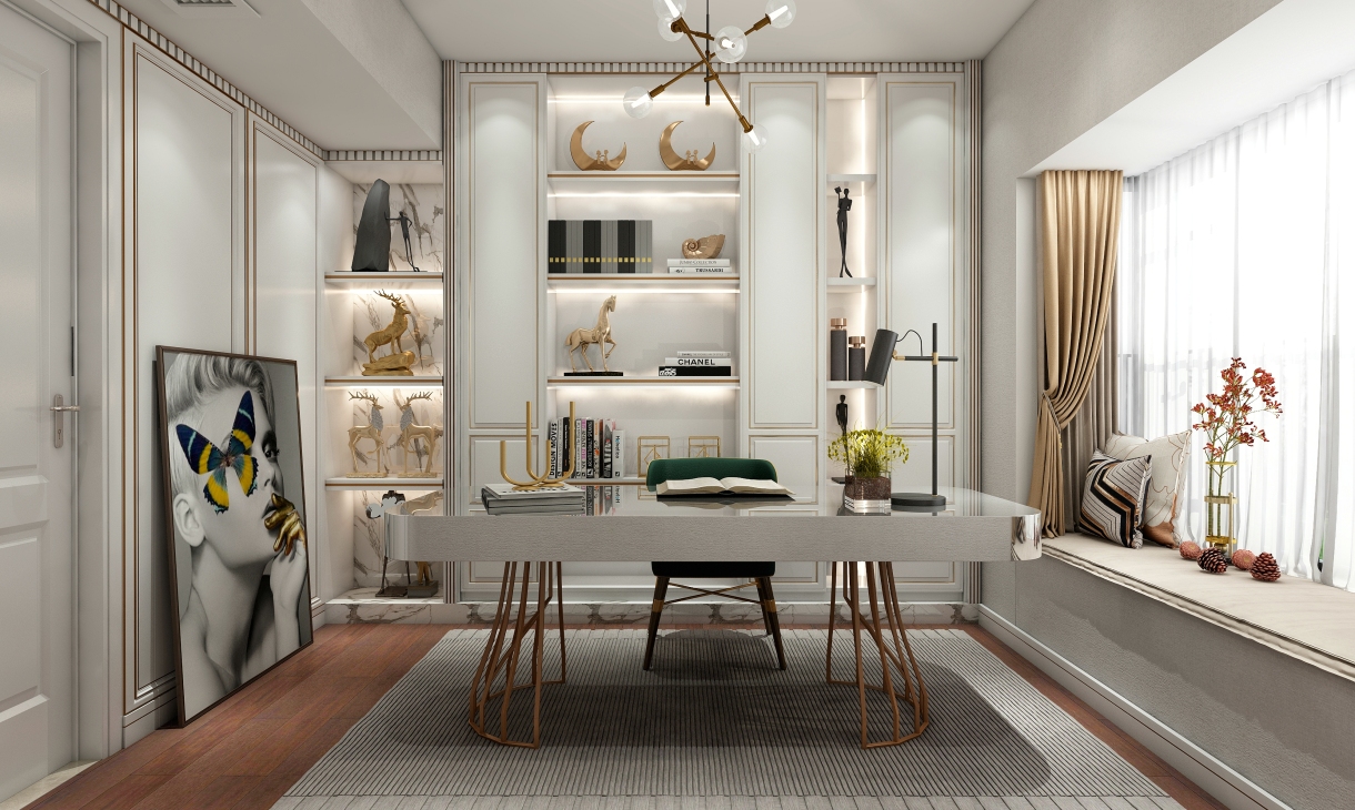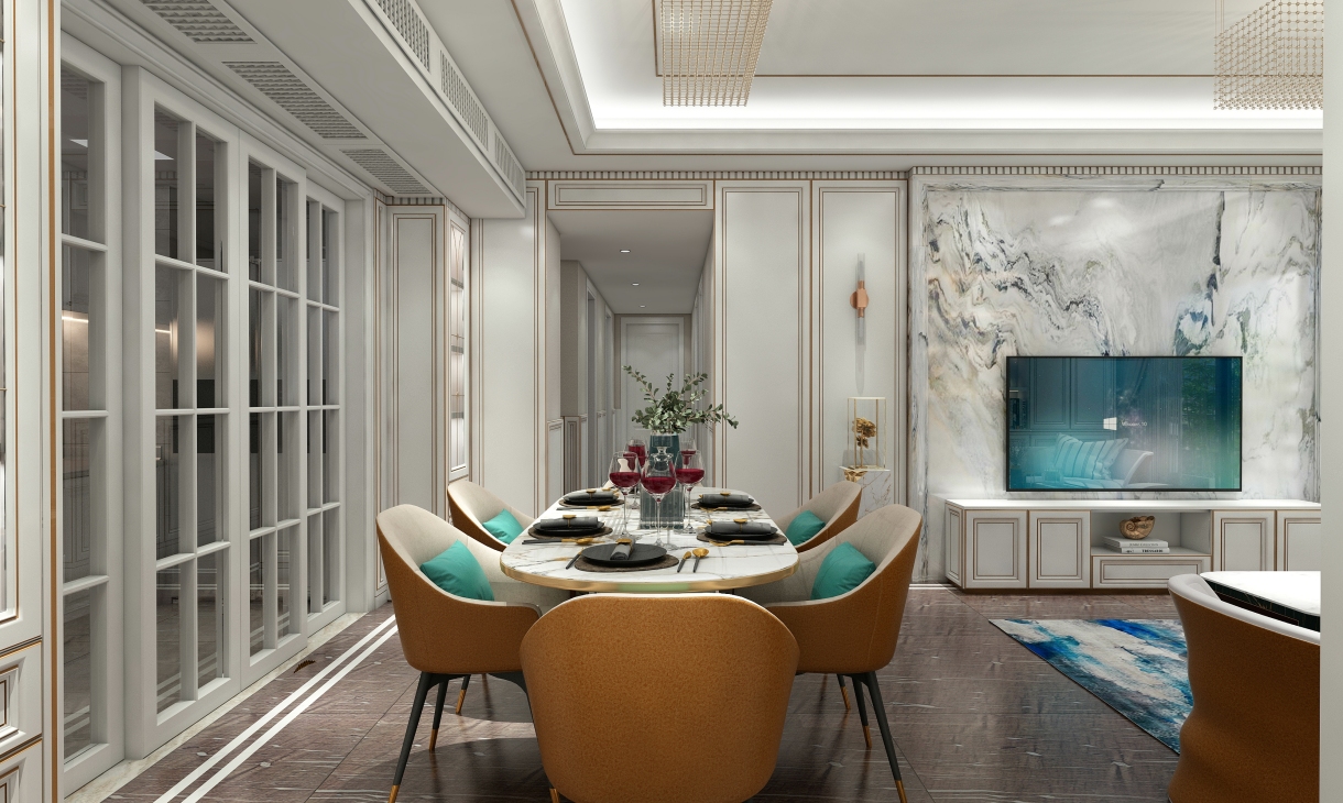 利用對稱的柜體設(shè)計配合壁爐形成空間的主墻體,滿足了展示和儲物功能的同時顯得空間古典大氣。