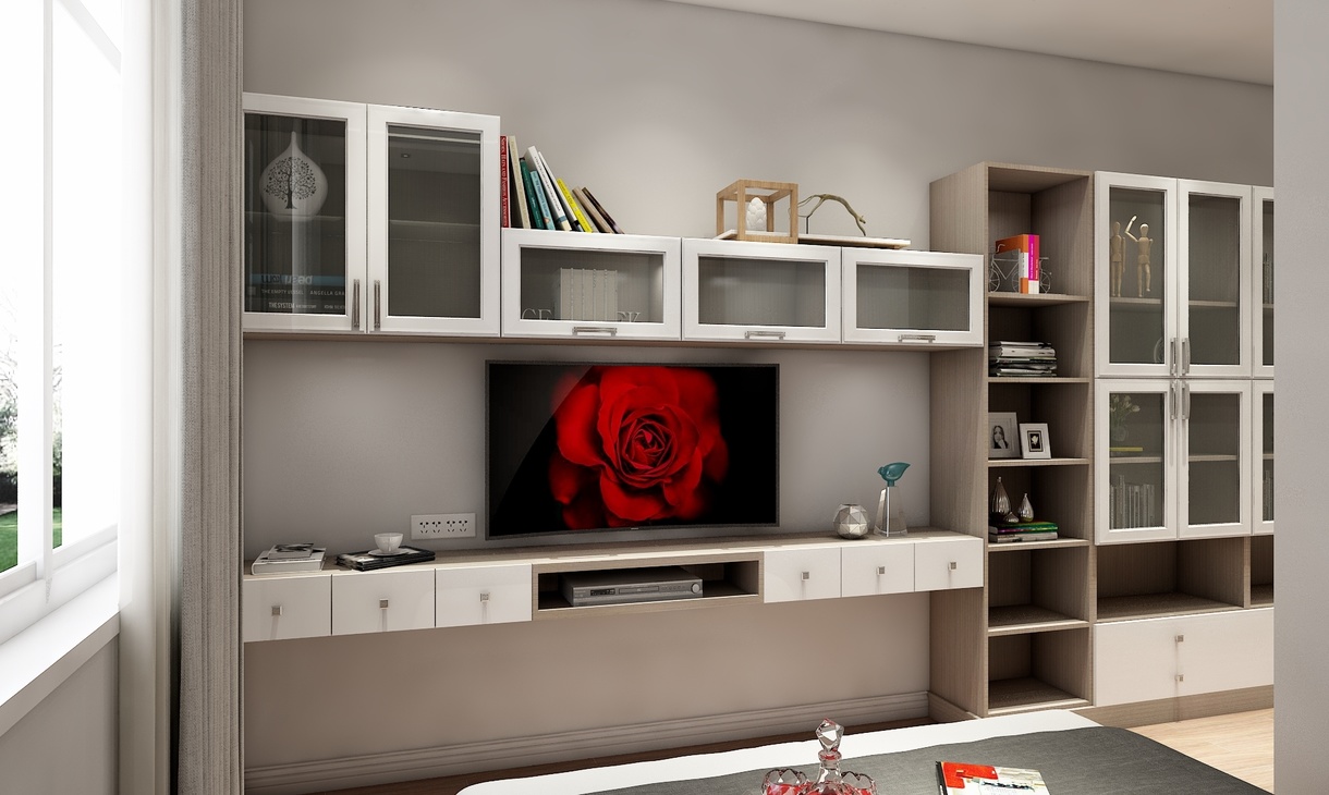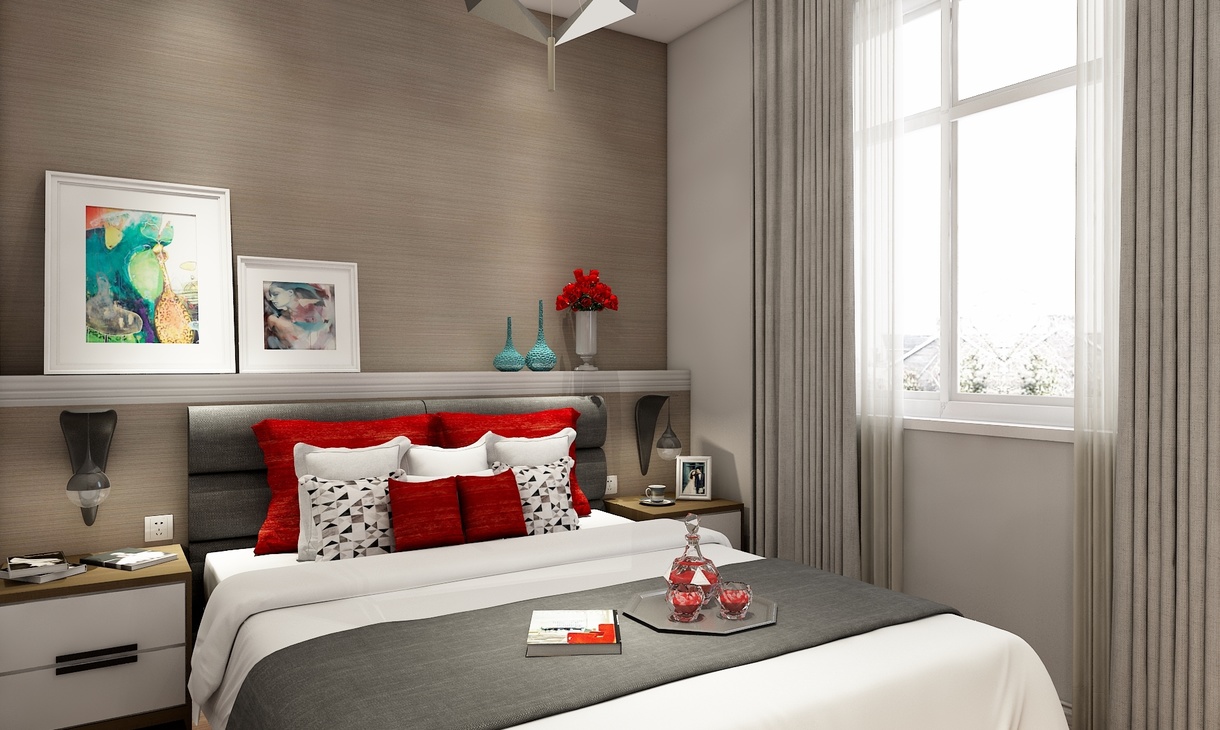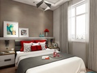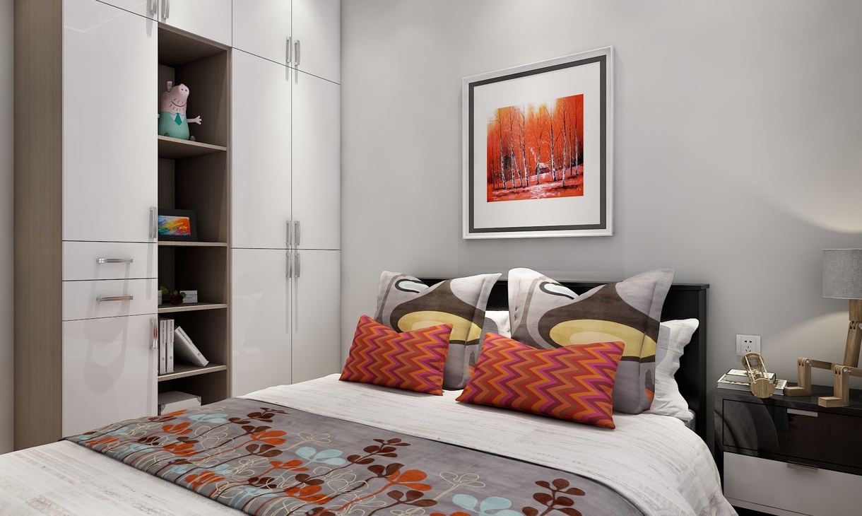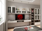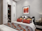 主臥床頭背景的燈光設(shè)計,營造安靜悠閑的睡眠區(qū),背景墻簡潔時尚;電視柜,吊柜與儲物柜相結(jié)合,整體美觀,增加了儲物功能。