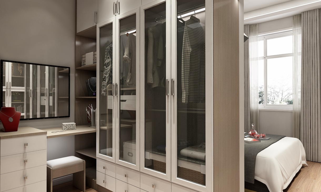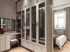 衣帽間的設(shè)計將衣柜與梳妝臺結(jié)合起來,節(jié)省空間,簡約時尚,衣柜采用半通透的方式,功能分區(qū)合理,更具現(xiàn)代時尚。