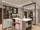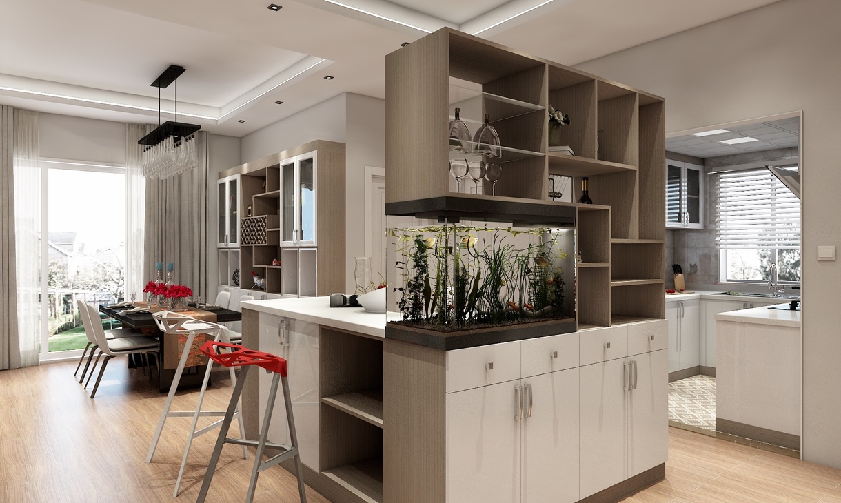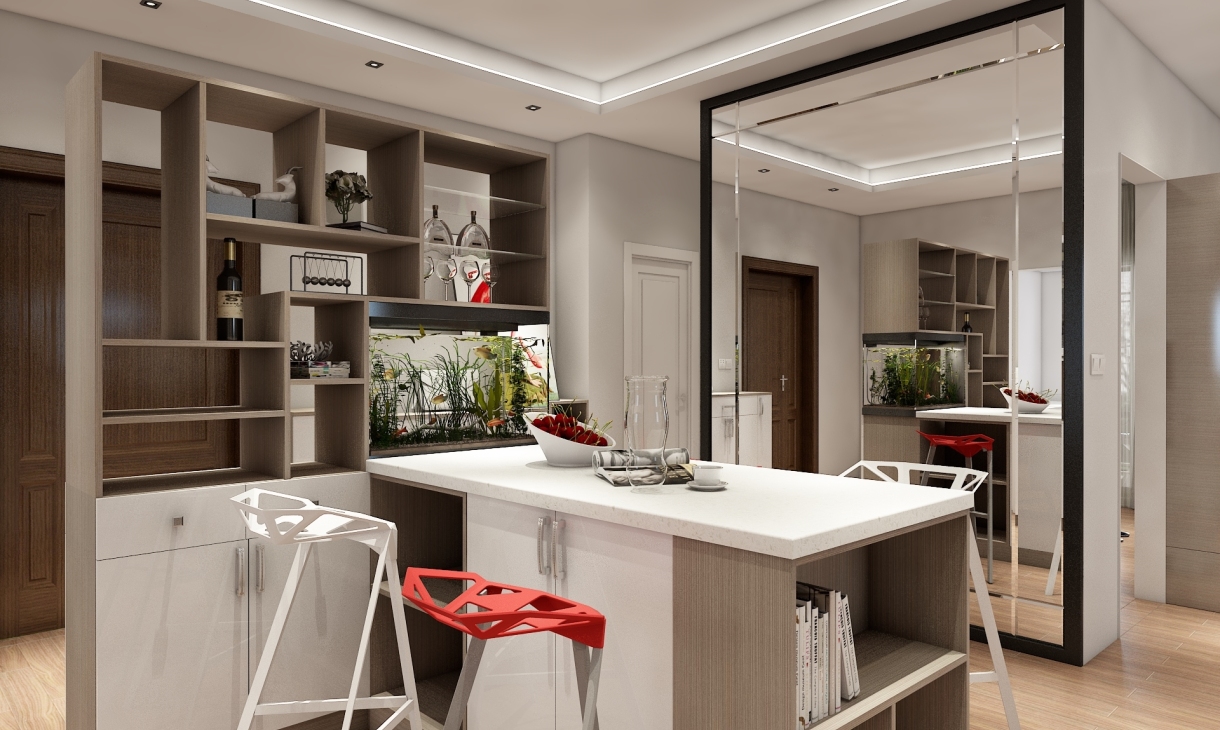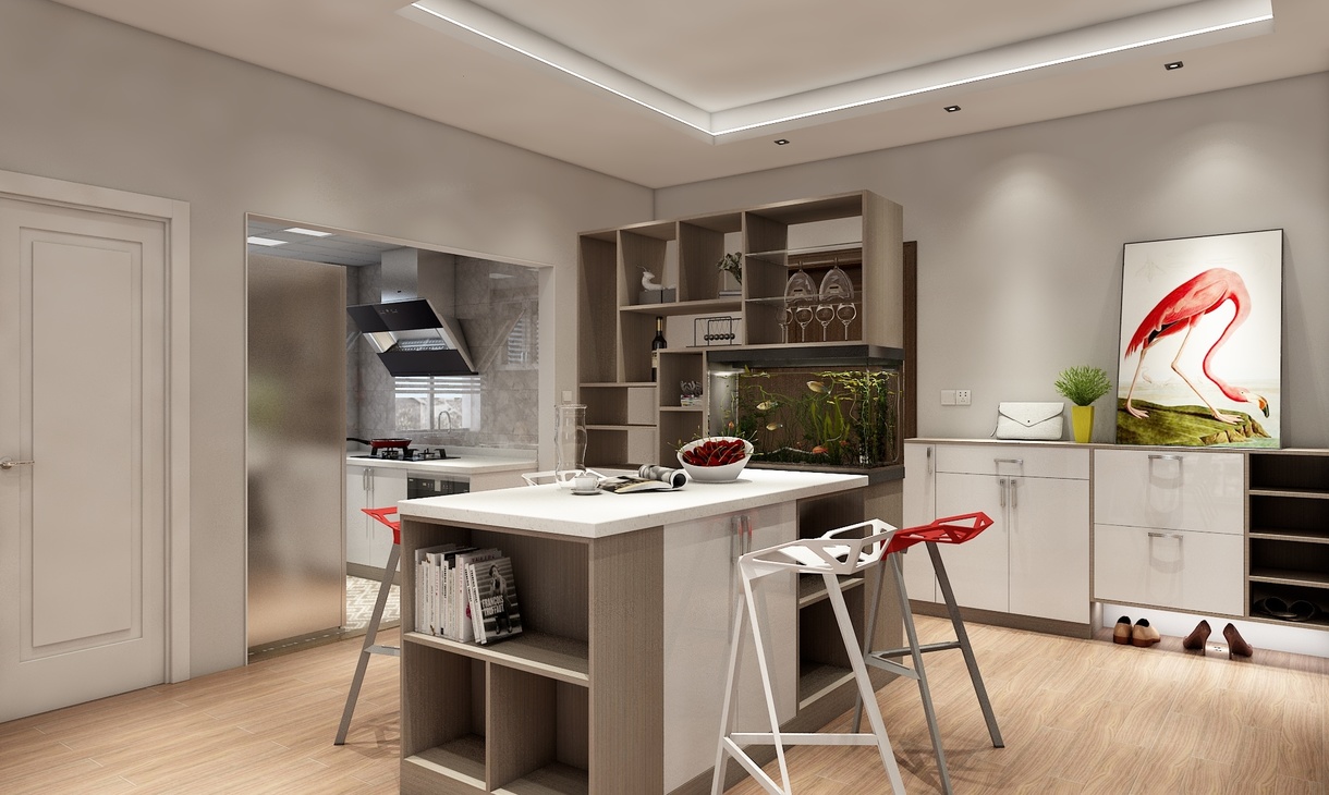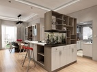 入戶玄關(guān),定制隔斷柜,上虛下實,即劃分了區(qū)域空間,又實現(xiàn)了空間通透明亮;隔斷柜與吧臺相結(jié)合,臨接開放式廚房與餐廳,方便實用;柜體設(shè)計了嵌入式魚缸,輕松愉悅。