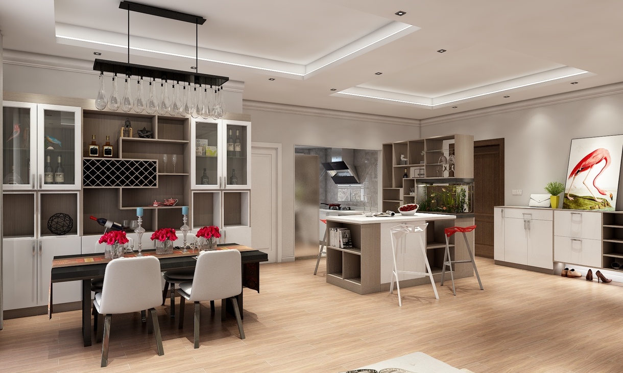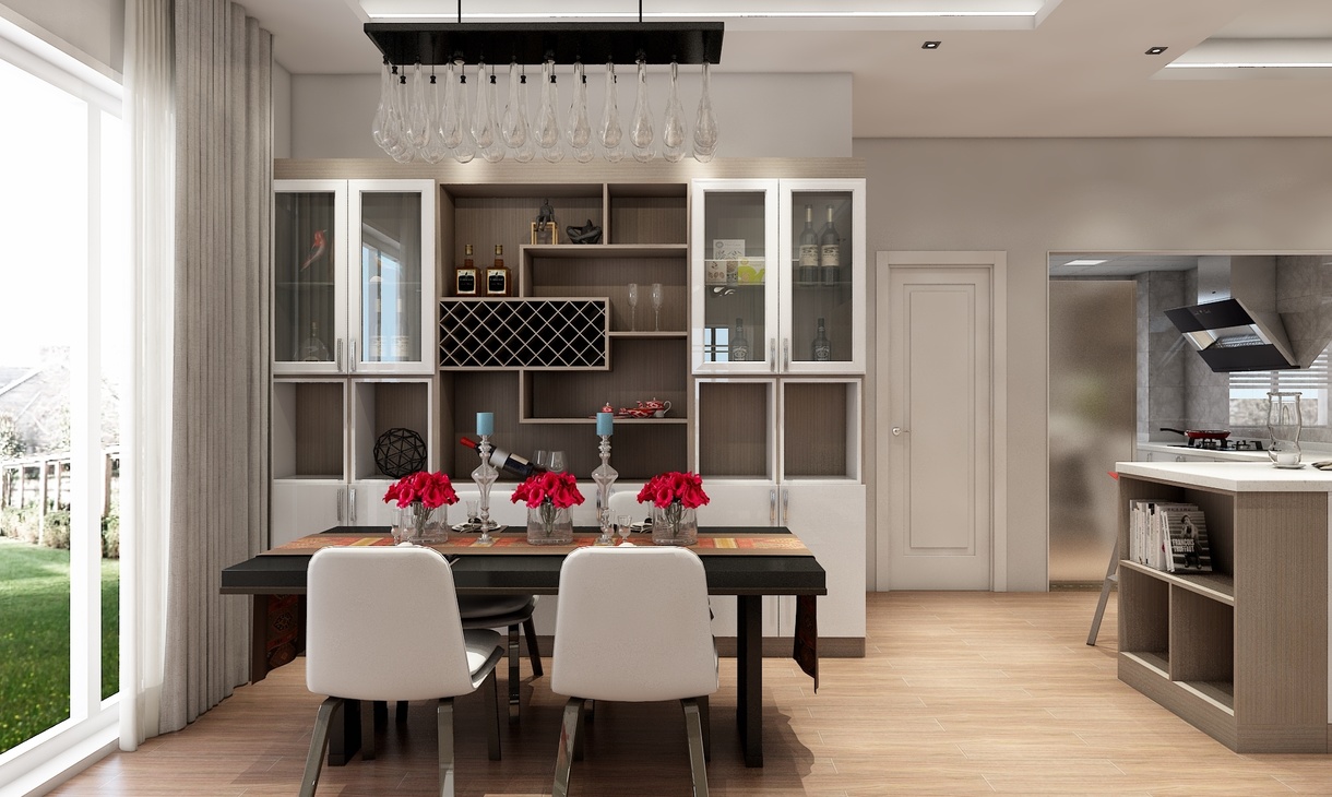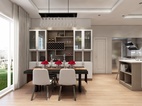 餐廳靠近大落地窗,采光通風良好,空間氛圍明快輕松,給人輕松愉快的就餐環(huán)境;酒柜設(shè)計美觀實用。