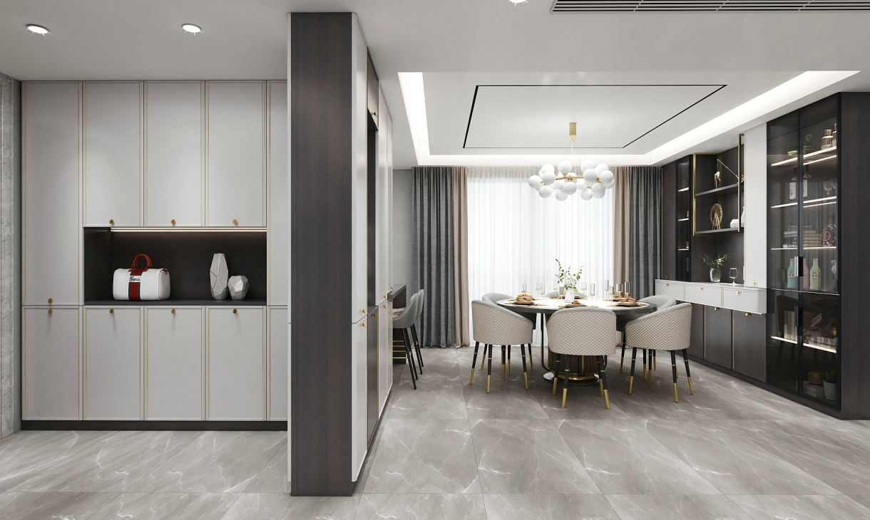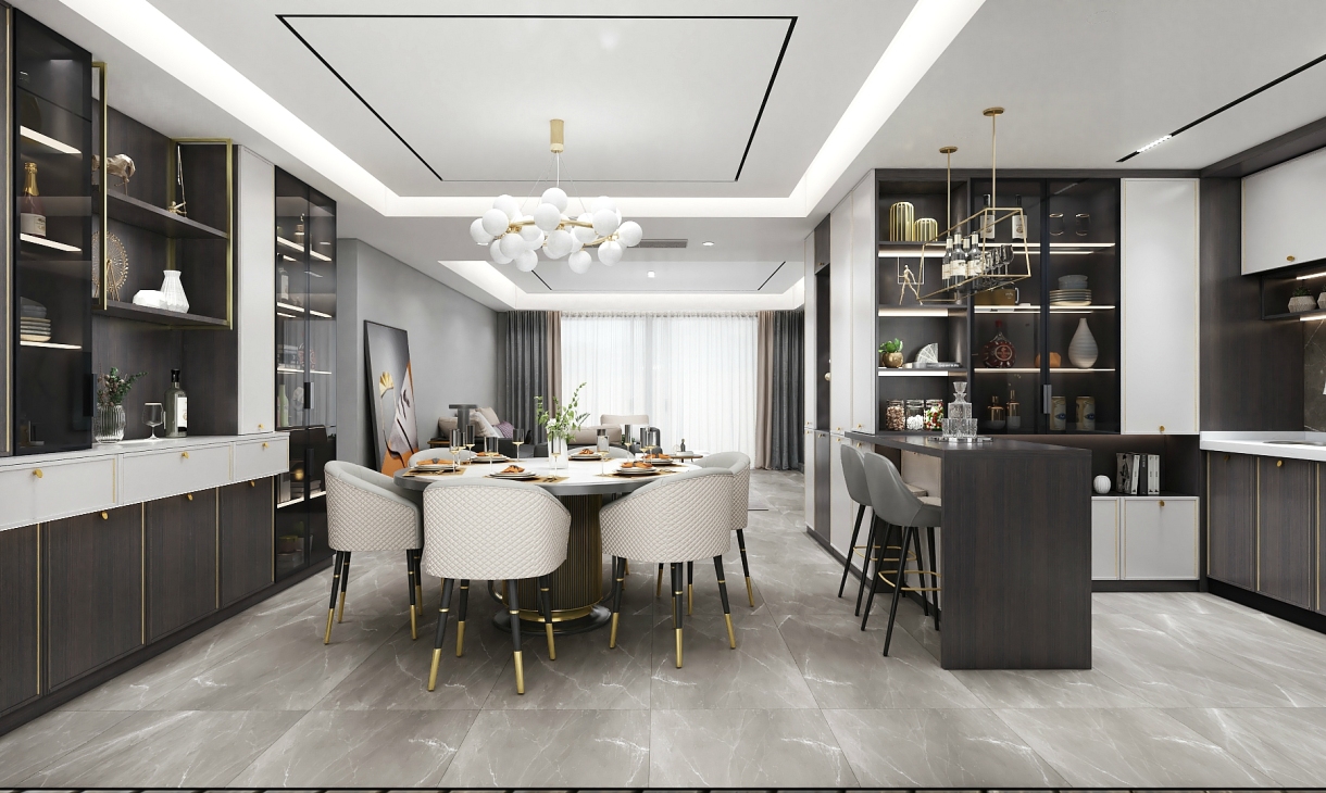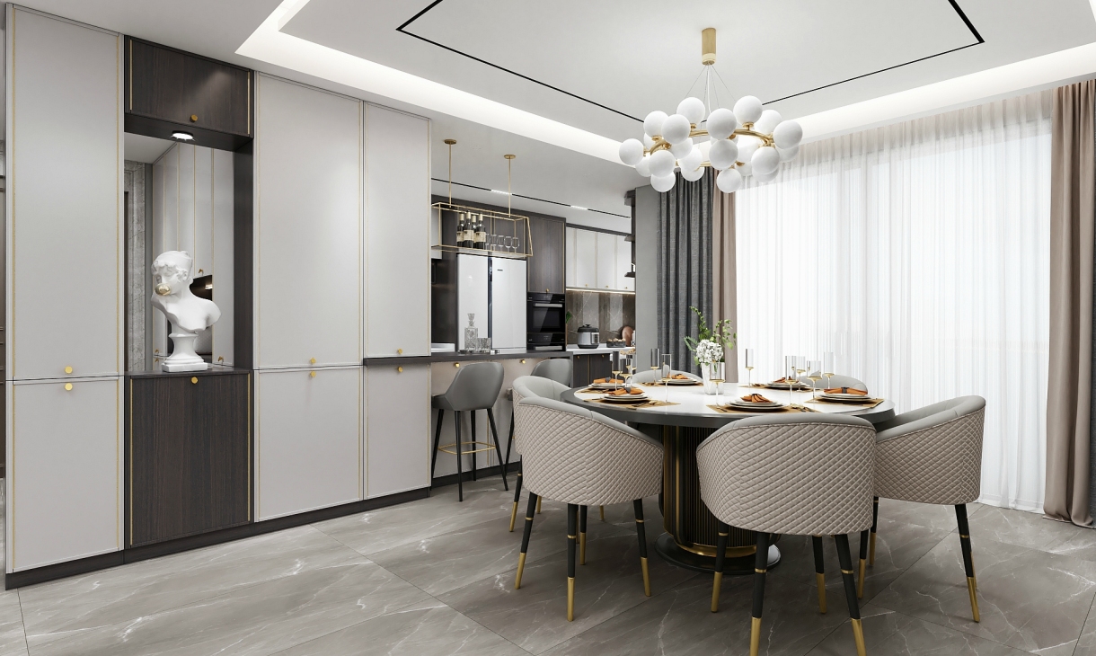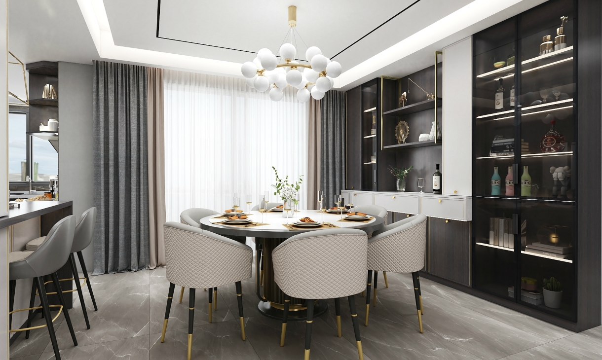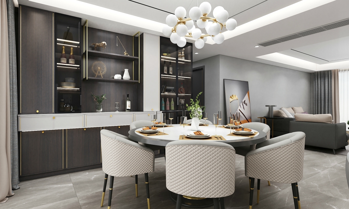 輕奢主義,是一種極致的簡(jiǎn)約風(fēng)格,它摒棄了傳統(tǒng)意義上的奢華,簡(jiǎn)化裝飾和線條,在極簡(jiǎn)之中返璞歸真,邂逅溫暖,同時(shí)也至精至雅,營(yíng)造不浮夸的高級(jí)感,真正的輕奢主義絕不是浮夸外露。在極具輕奢風(fēng)的餐廳中選用了米白色布藝與黑色來進(jìn)行搭配,再輔以創(chuàng)意壁掛與仿真鮮花來點(diǎn)綴,讓兩者相呼應(yīng),展現(xiàn)出一種優(yōu)雅清新美感。