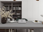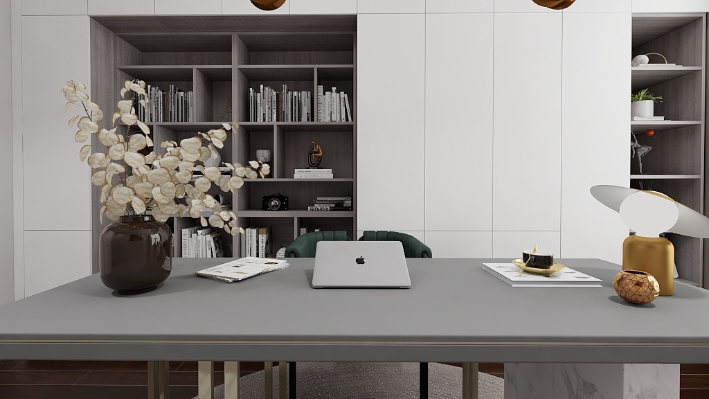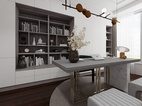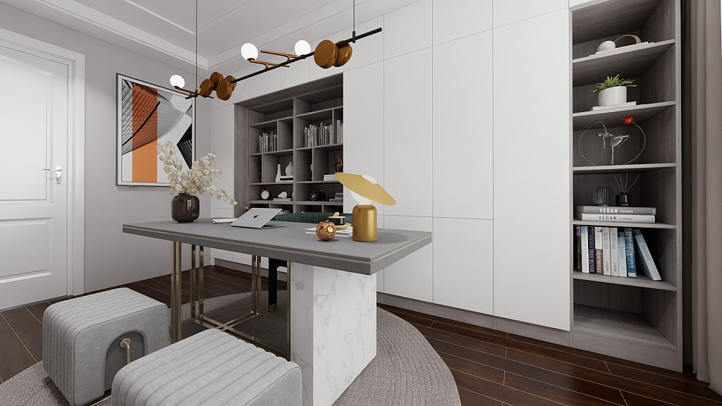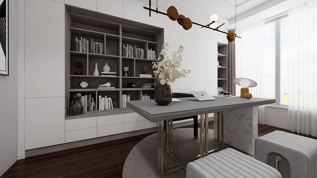 書房空間采用了極簡設(shè)計,墻面全部做的藝術(shù)漆,簡約的線條感書桌搭配極簡書柜。中間的中古風(fēng)黃銅吊燈給整個空間帶來更多的時尚元素和豐富感