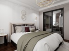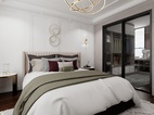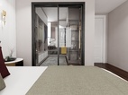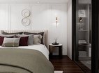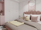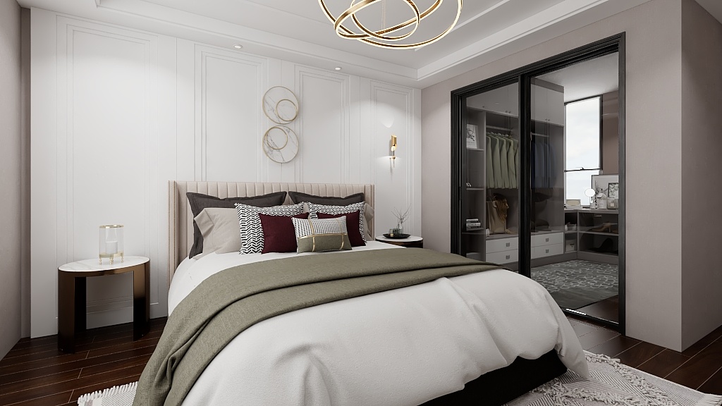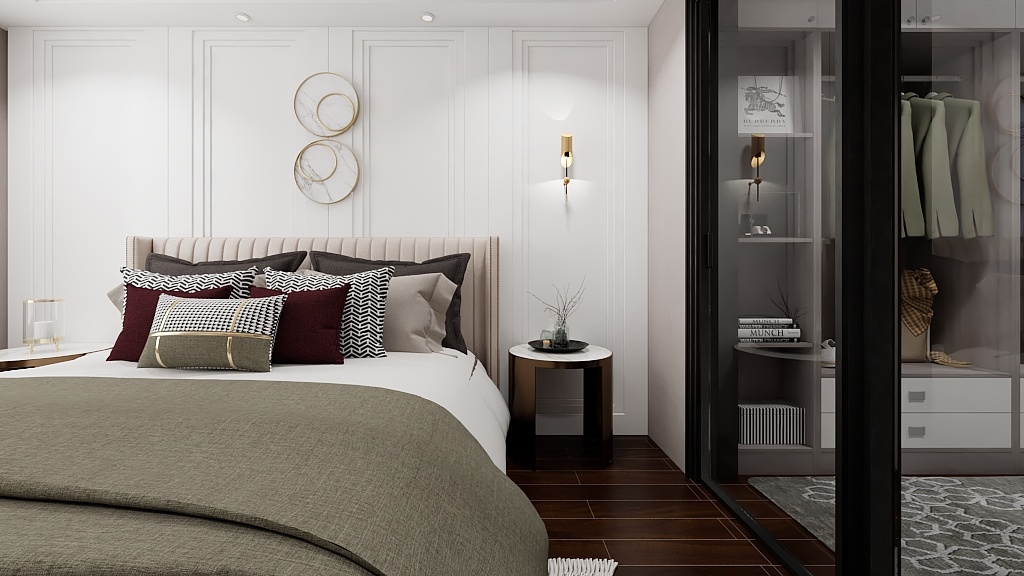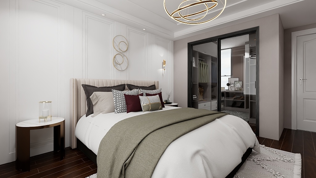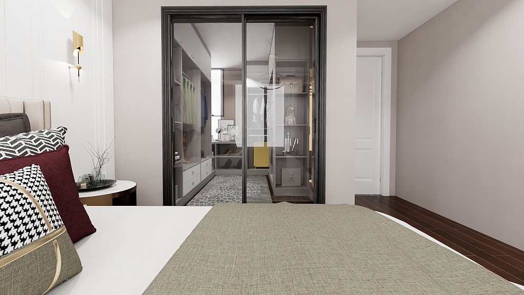 主臥步是帶衣帽間臥室,暖粉與白色的搭配,是柔軟與休閑的表現(xiàn)。吊頂內(nèi)圈的柵格豎紋,墻板材質(zhì)的框形回路,床頭軟墊的弧形紋路,飾品柜的金屬架,干凈利落的線條搭配豐富的紋理營造了整個空間的質(zhì)感