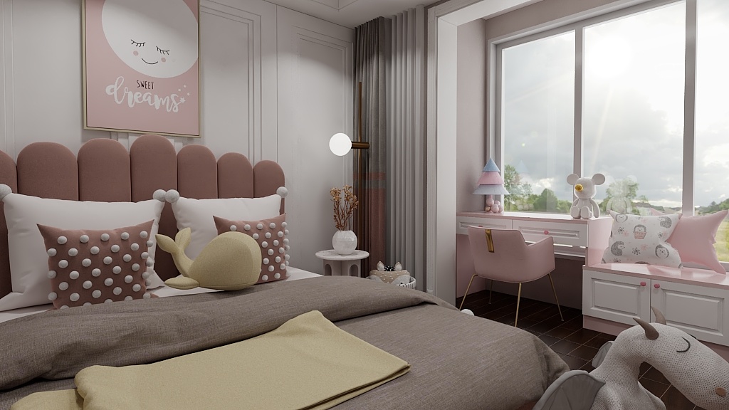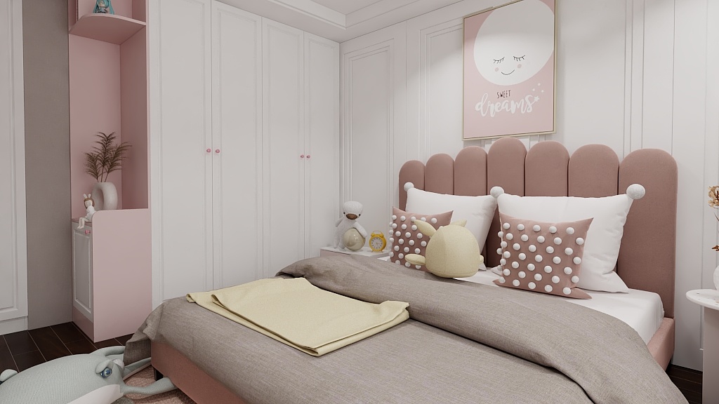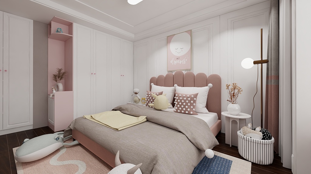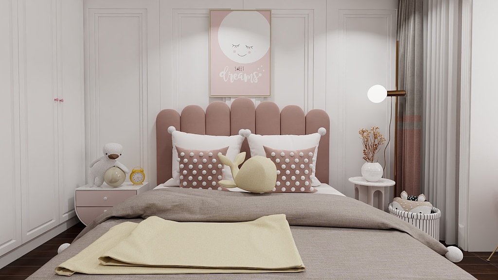 兒童房墻布采用飽和度低的灰紫色理性與可愛兼具,床頭和柜子用的選用象牙白整個空間以明亮、輕松、愉悅為主的顏色進(jìn)行搭配,兒童房的采光大窗戶,在書桌上閱讀學(xué)習(xí)心情愉悅。