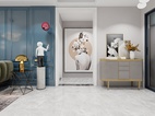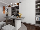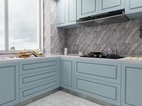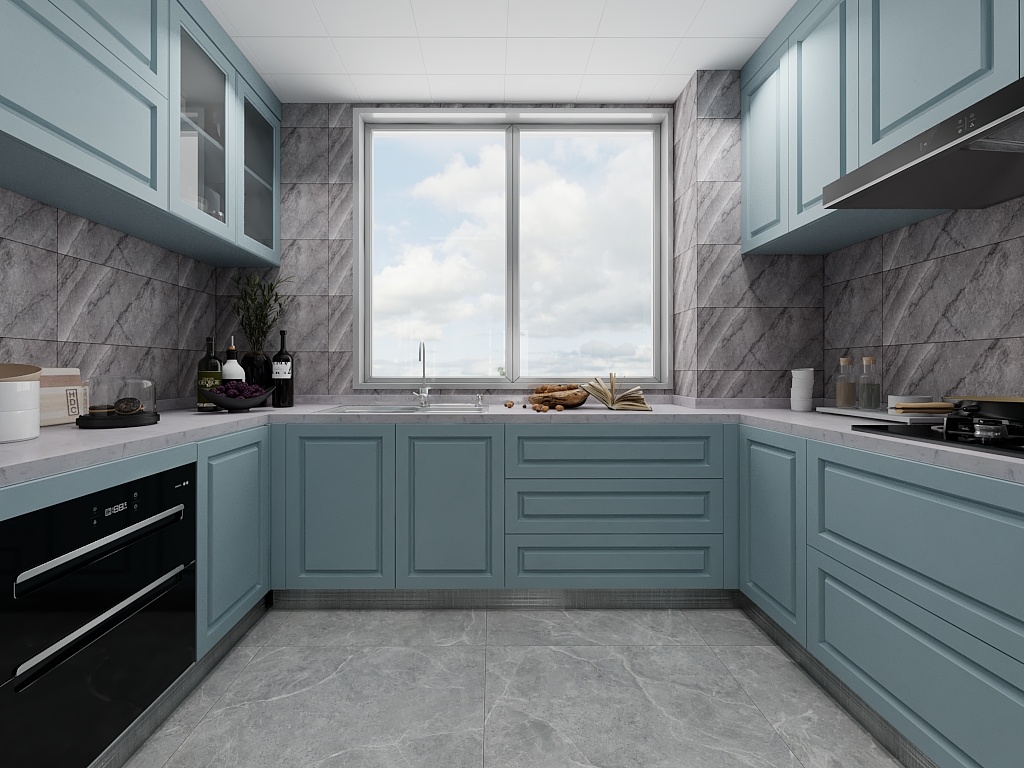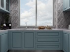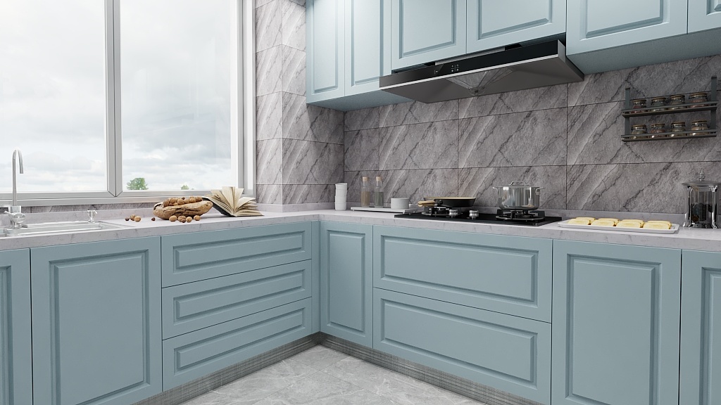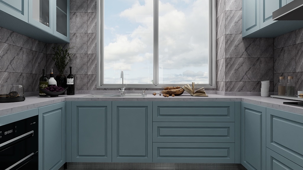 扇外掛移門,關(guān)閉是能確保廚房所需的密閉要求,打開時也能給予了廚房餐廳間更多交流互動可能性,色彩基調(diào)上選用了啞光卡地亞藍(lán),但為了突出質(zhì)感,采用了淡紋路的大理石作為裝飾。