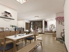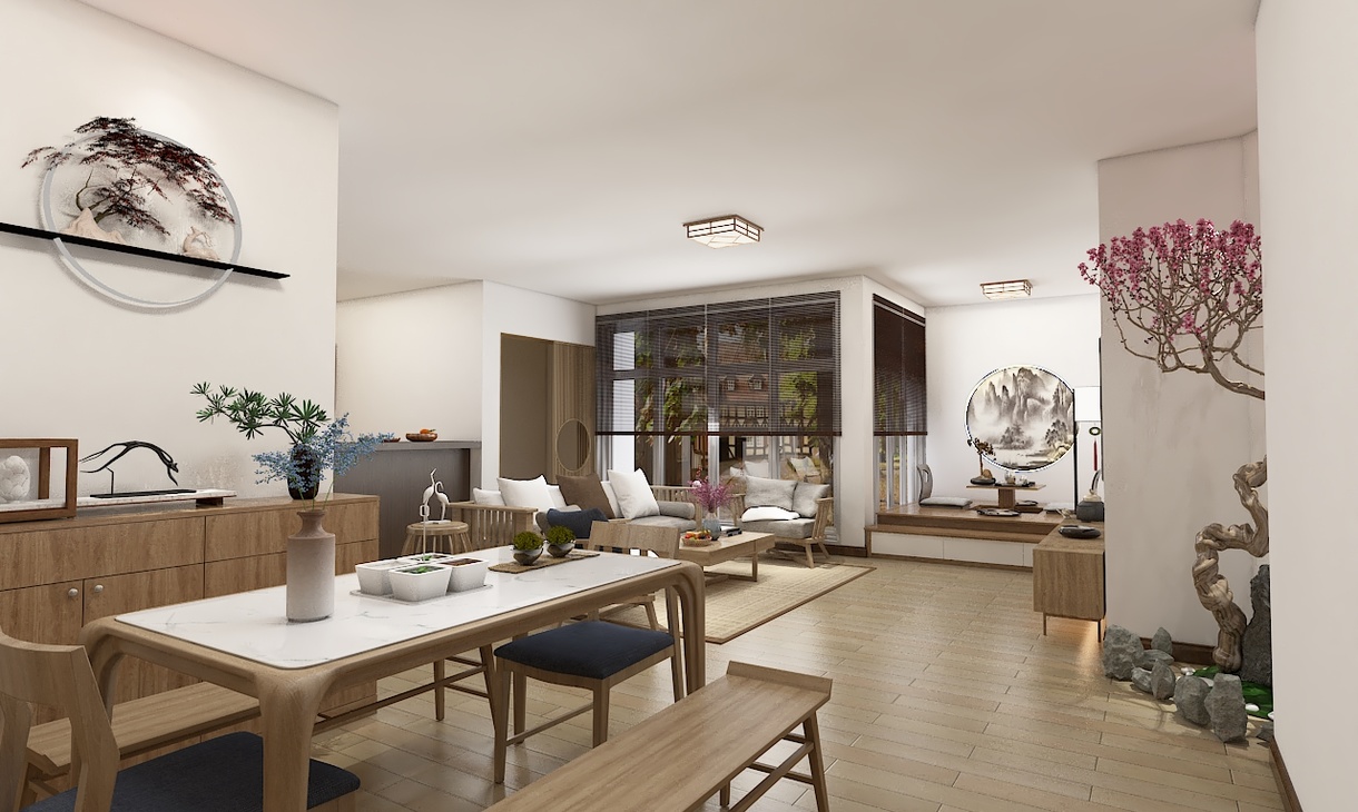 溫暖的簡普的場景使人放松,家具與布藝完美結(jié)合了布藝和原木的自然親和感,就餐區(qū)與休閑區(qū)才用花藝中的櫻花裝飾,將休閑與就餐完美分離出來。簡約而自然的軟裝陳列,給人一種返璞歸真的生活氣息。