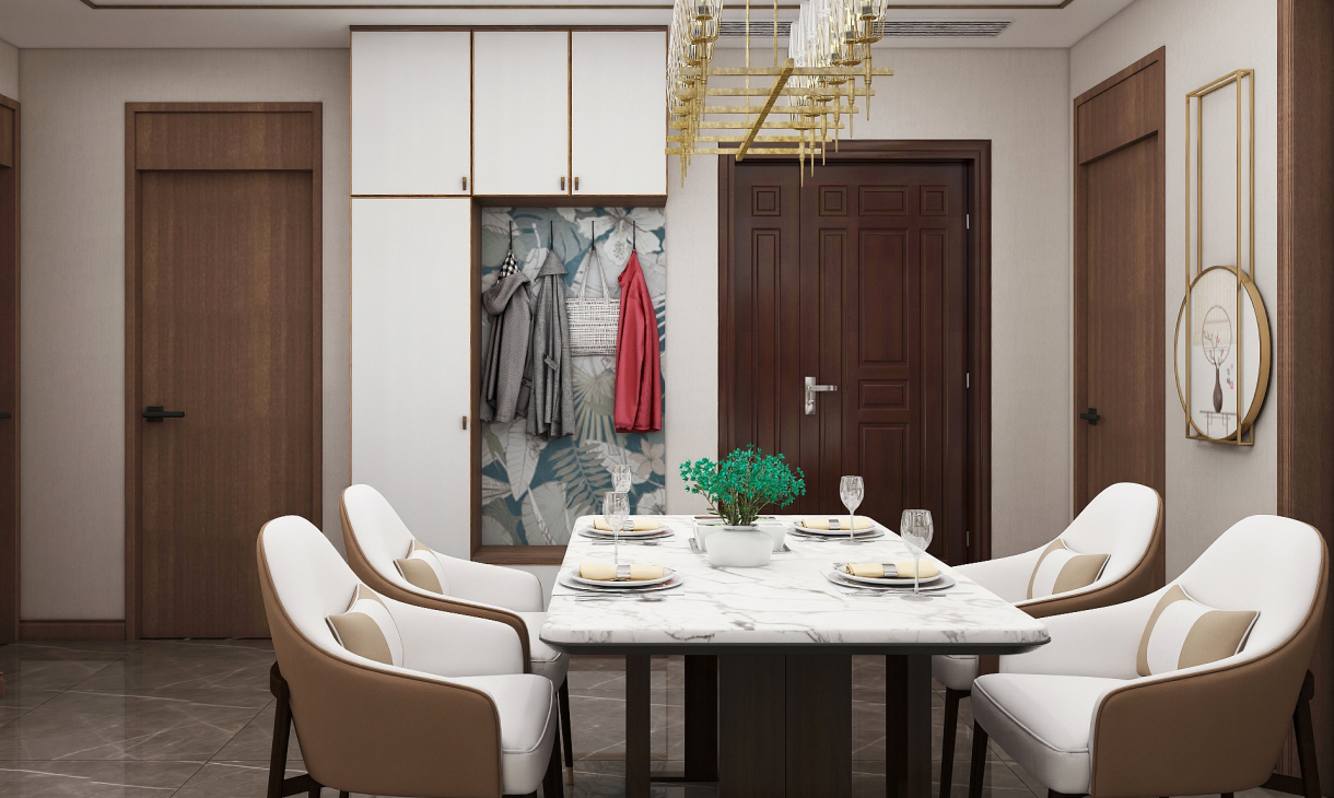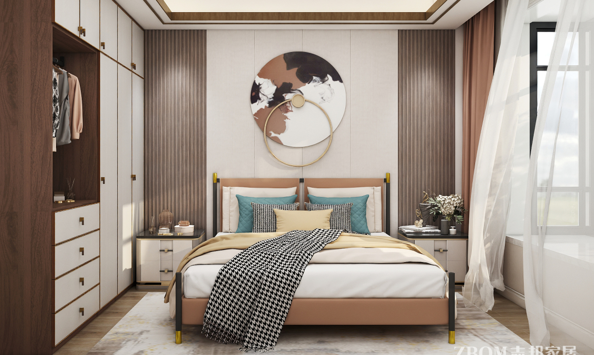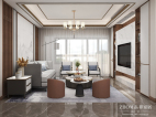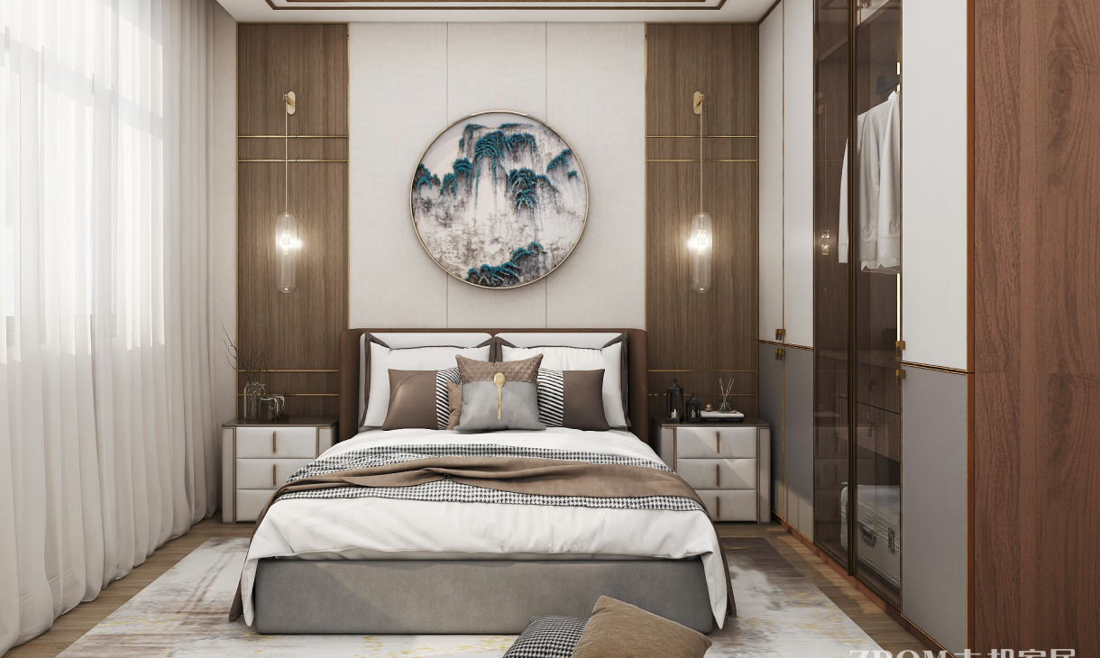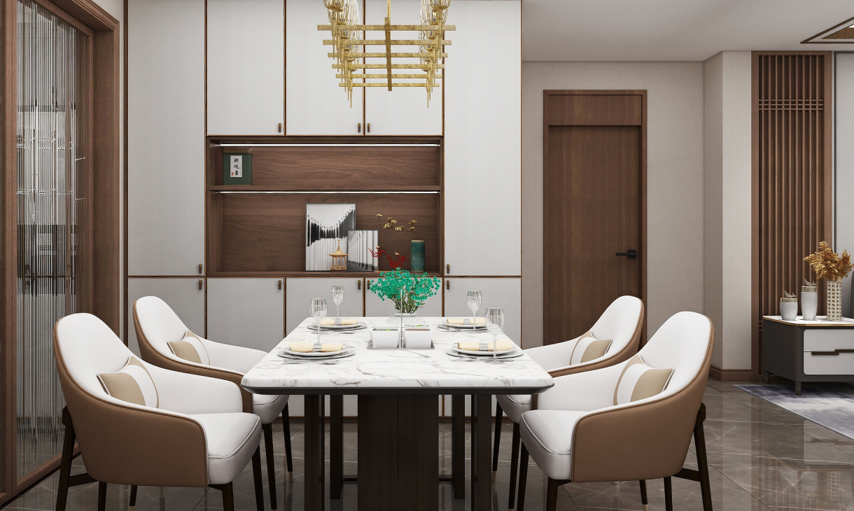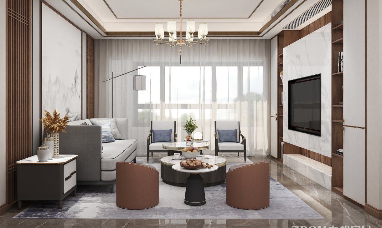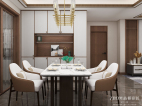 隱約的水墨背景與兩側(cè)的木制屏風(fēng),構(gòu)成虛與實(shí),疏與密的哲學(xué)均衡美,茶幾大理石的紋路自然演繹了一幅自然山水之美,賦予空間綿綿不盡的詩(shī)意想象。整個(gè)空間中,沒(méi)有任何顯著的東方符號(hào)堆砌,言有盡,意無(wú)聲,卻自始至終浸透著東方特有的禪思靜謐。中式情韻以簡(jiǎn)雅靜寧的格調(diào)呈現(xiàn)出來(lái),讓居者在木作的紋理、陽(yáng)光的滲透、清茶的幽香中,品味生活的煙火氣與安適感。