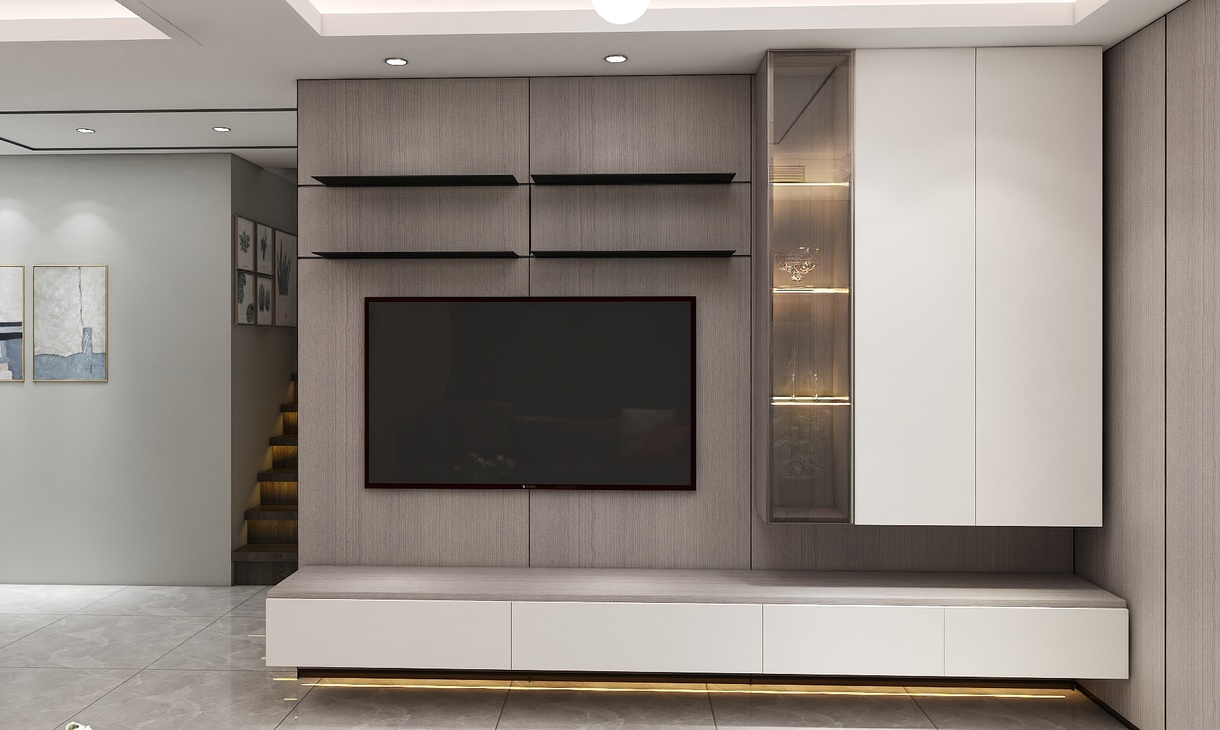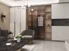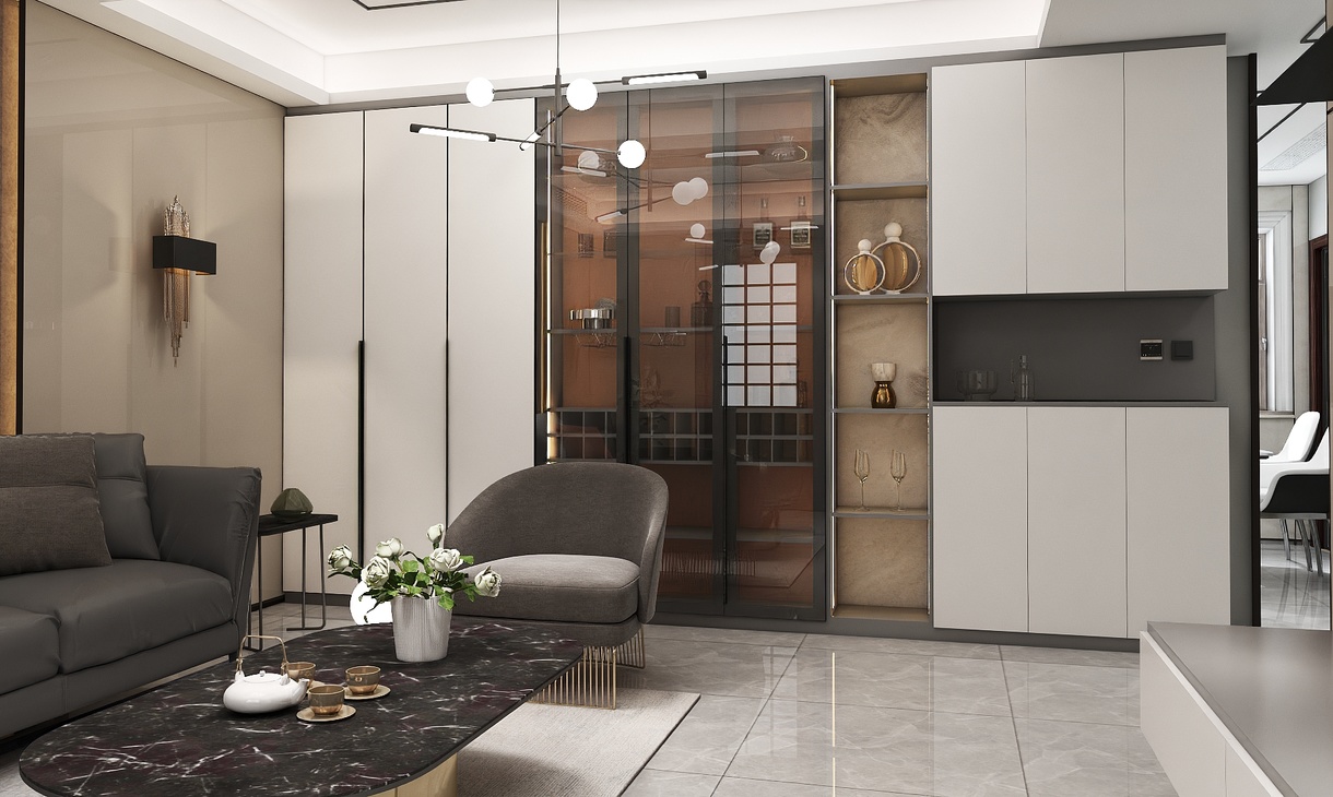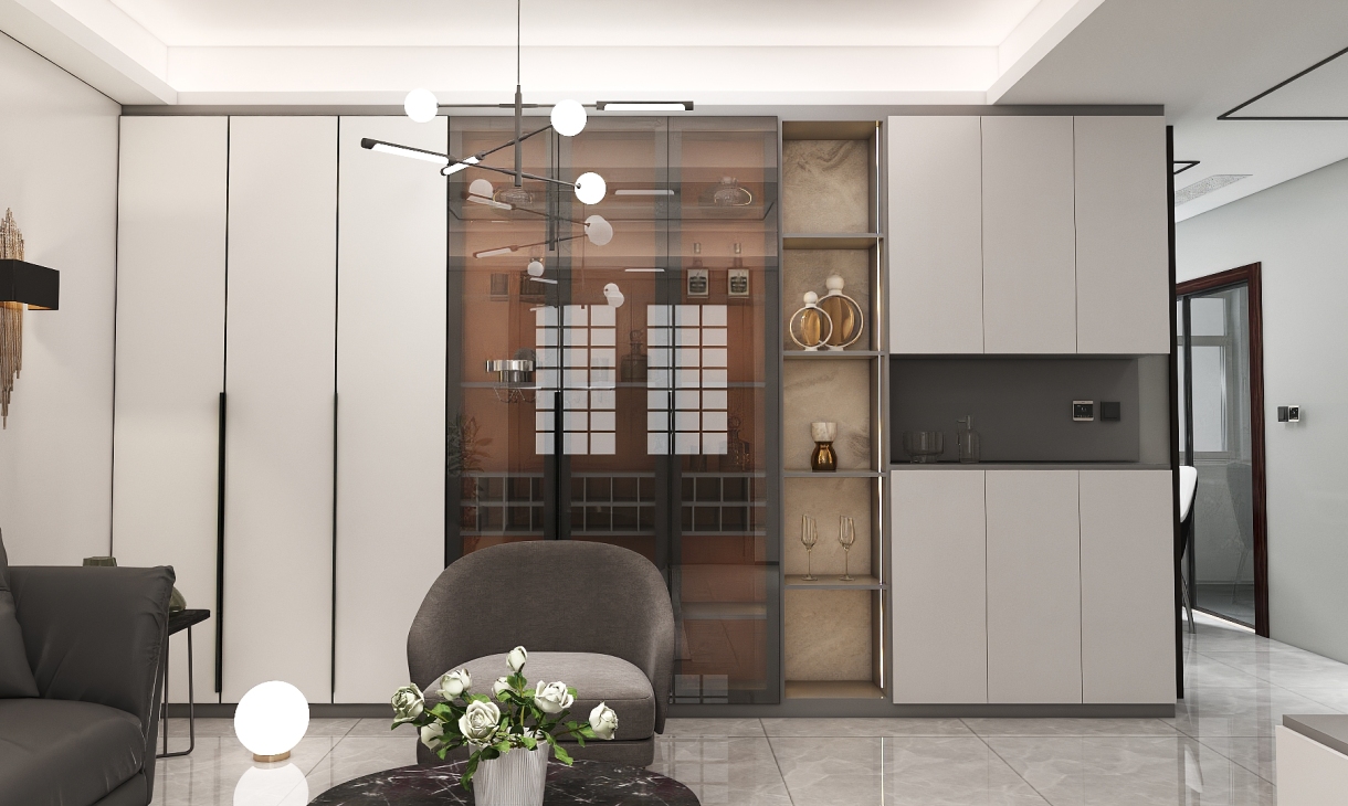 本方案為二層洋房的一樓,坐北朝南為過(guò)年回老家及退休以后的生活居住空間,整體色調(diào)偏明亮,結(jié)合業(yè)主的喜好為其設(shè)計(jì)了有超強(qiáng)收納空間的酒柜。