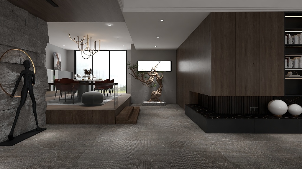 客廳與餐廳顏色相互呼應,整體視覺效果統(tǒng)一,也加入了粗獷的石材墻面裝飾,空間的層次感很強,通過用原木的元素和色調(diào)讓空間看上去更加柔和。
