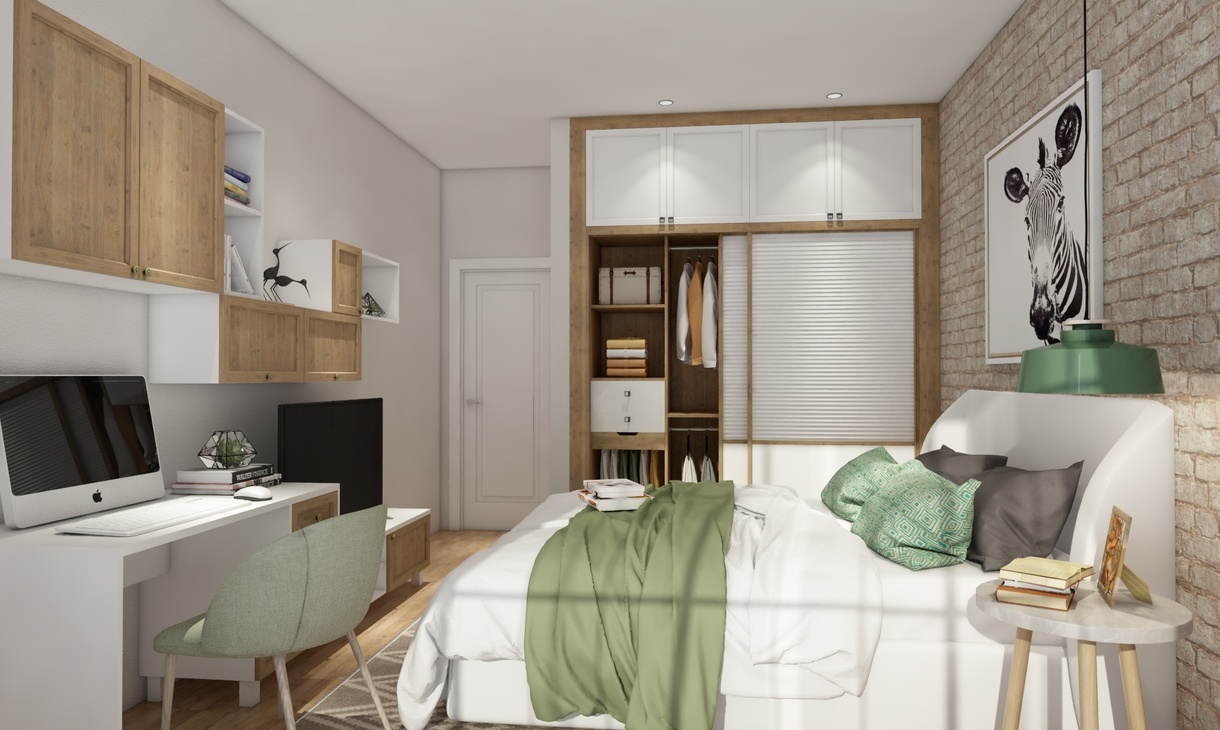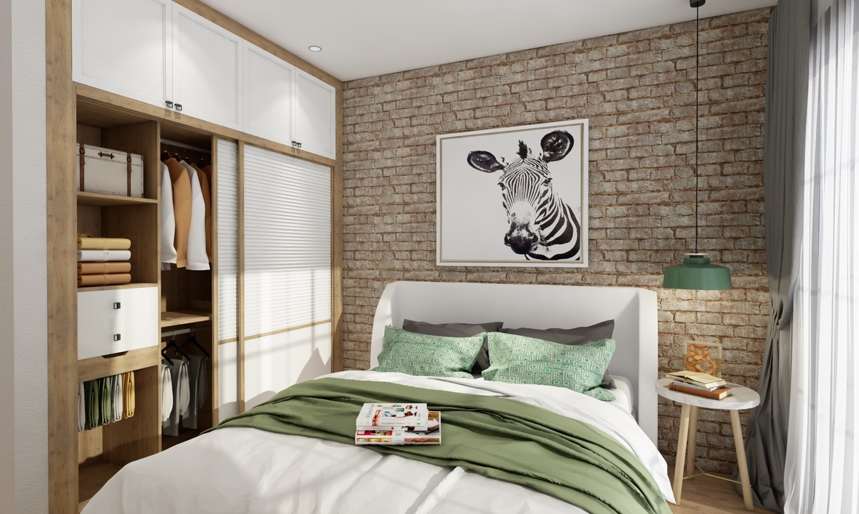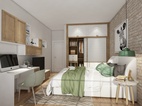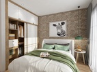 主臥地板采用實木木地板,做了嵌入式衣柜,臥室整體給人春天的氣息,溫馨感十足。床頭安裝了吊燈,有燈的照明,睡前可以看看書。