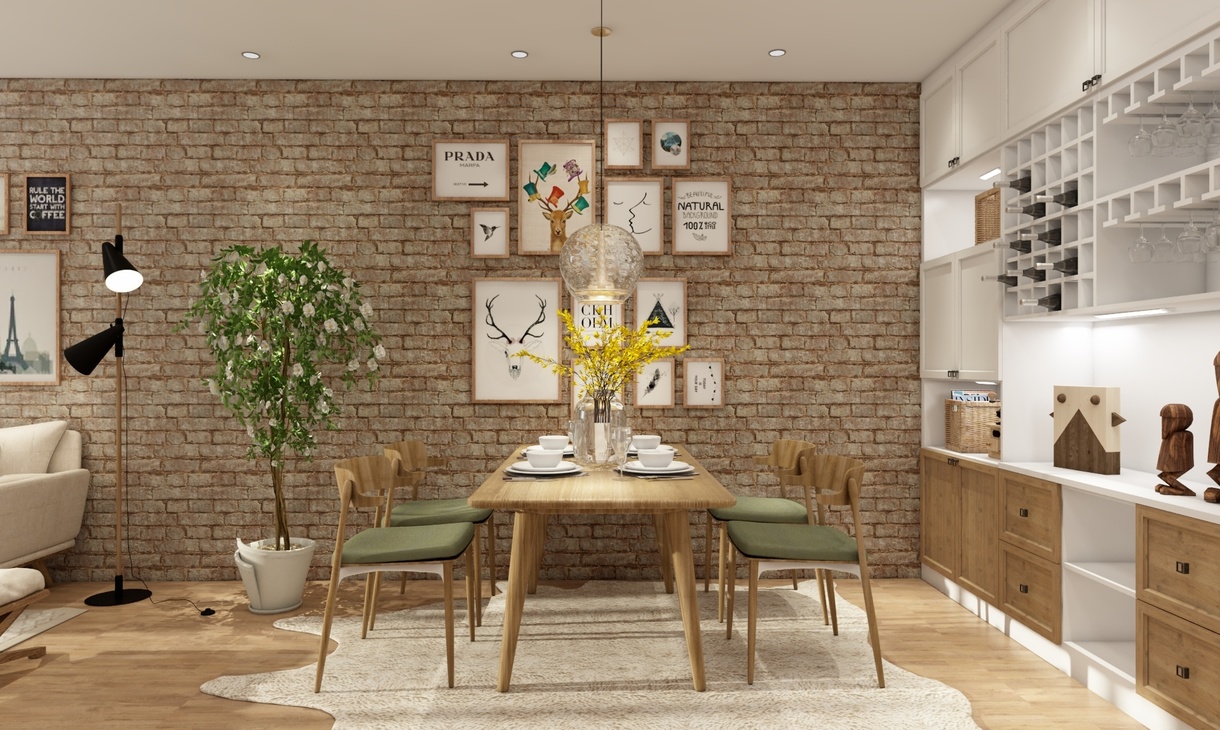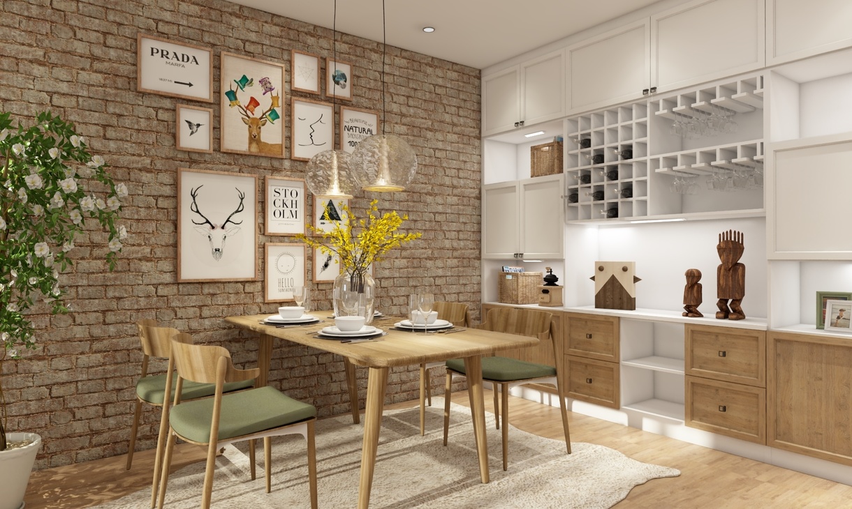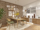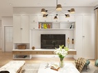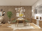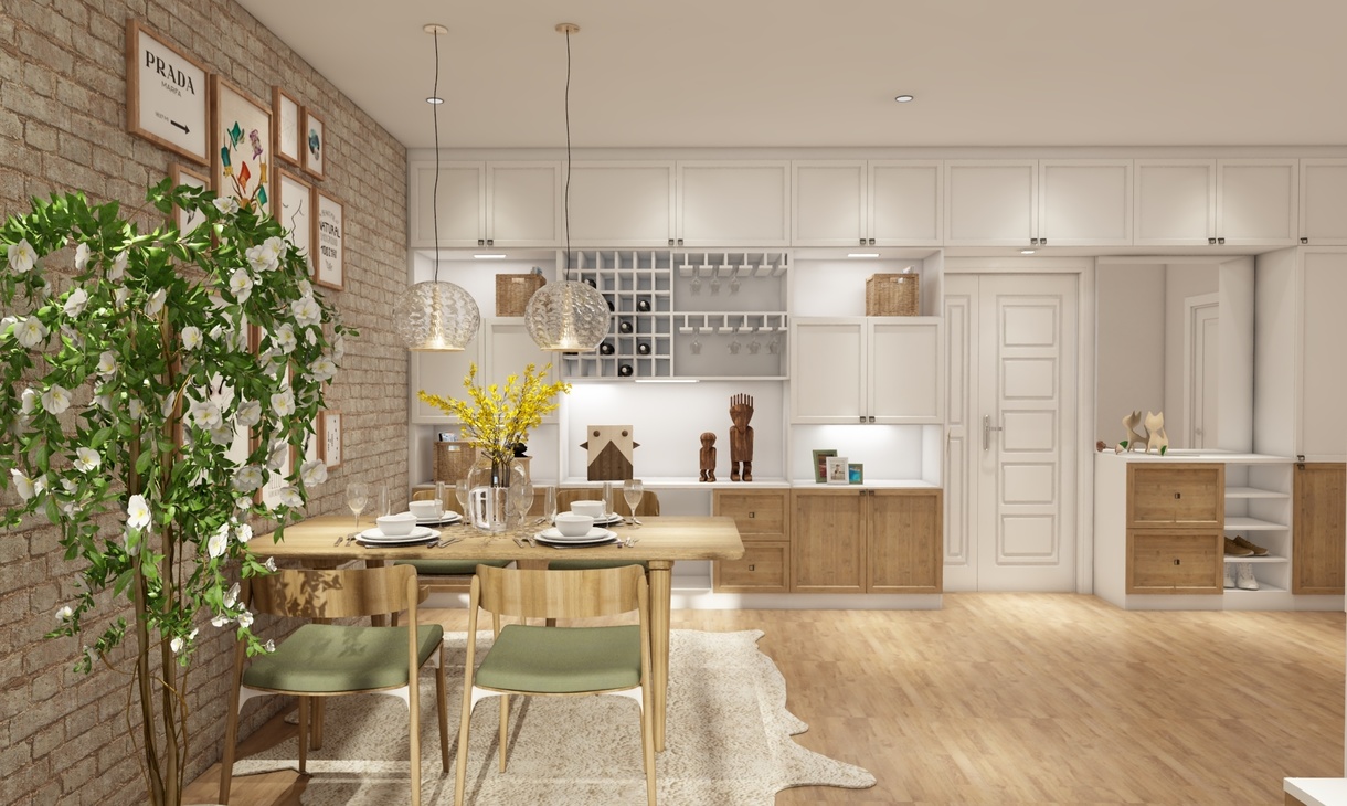 客廳,在功能上滿足大部分人的生活需求,電視柜做了整墻,集收納展示與視覺于一體。沙發(fā)背景滿墻面的復古磚,沙發(fā)邊幾上放置了綠色復古老式電風扇,與休閑沙發(fā)顏色相呼應。而綠色可以緩解主人長期坐在沙發(fā)上看電視的視覺疲勞。餐廳在入戶門的墻面定制功能組合柜,讓餐邊柜與鞋柜連接成一體。這樣,不浪費空間的同時還能儲物
