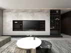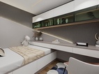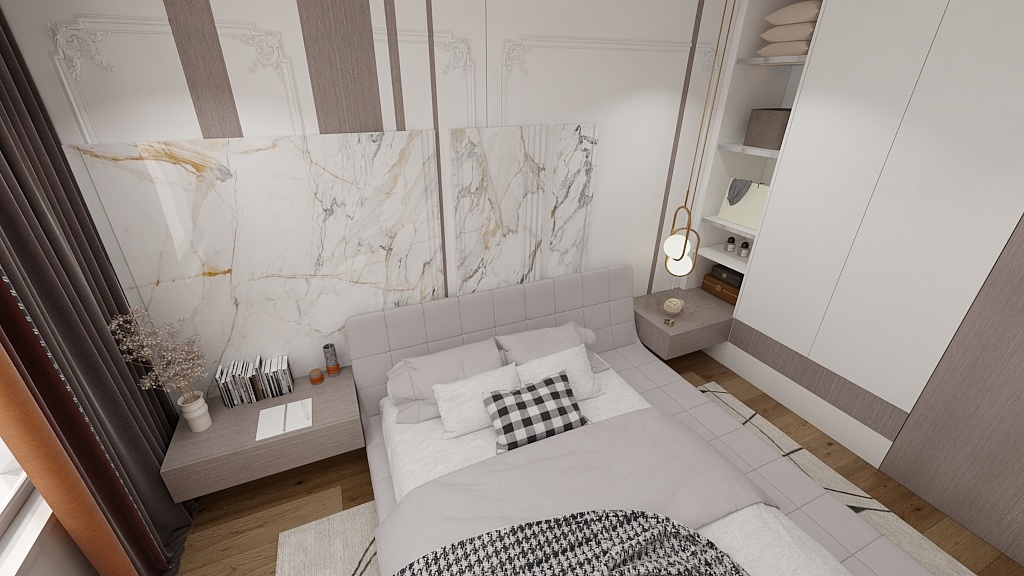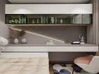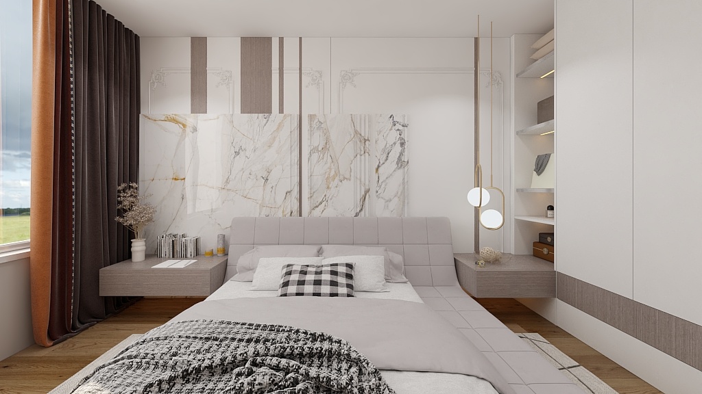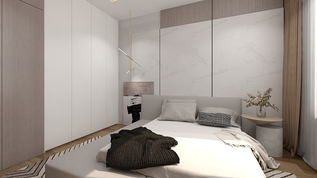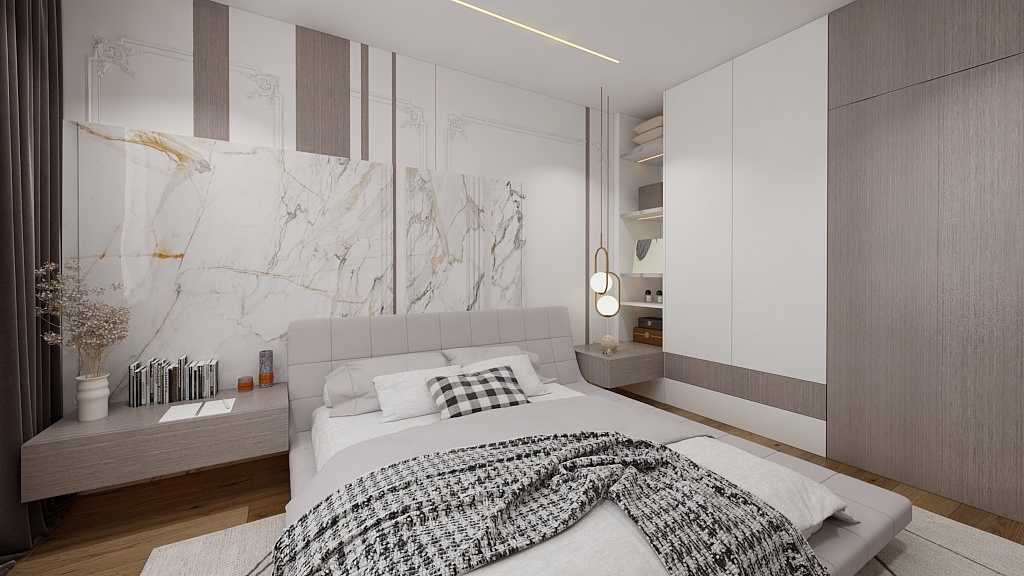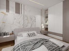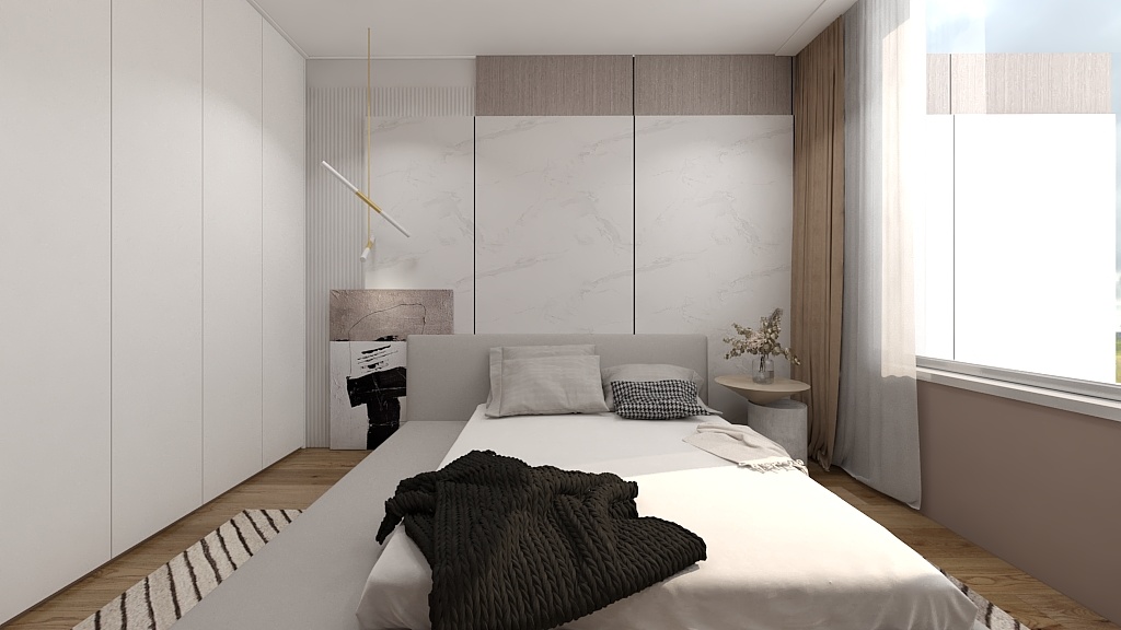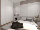 此臥增設(shè)白色收納柜上下通體門板,方便平時存儲物品。與背景墻呈L型排布,在滿足使用范圍的同時,將自然光線很好的引入進來,更顯整潔明亮。