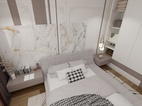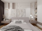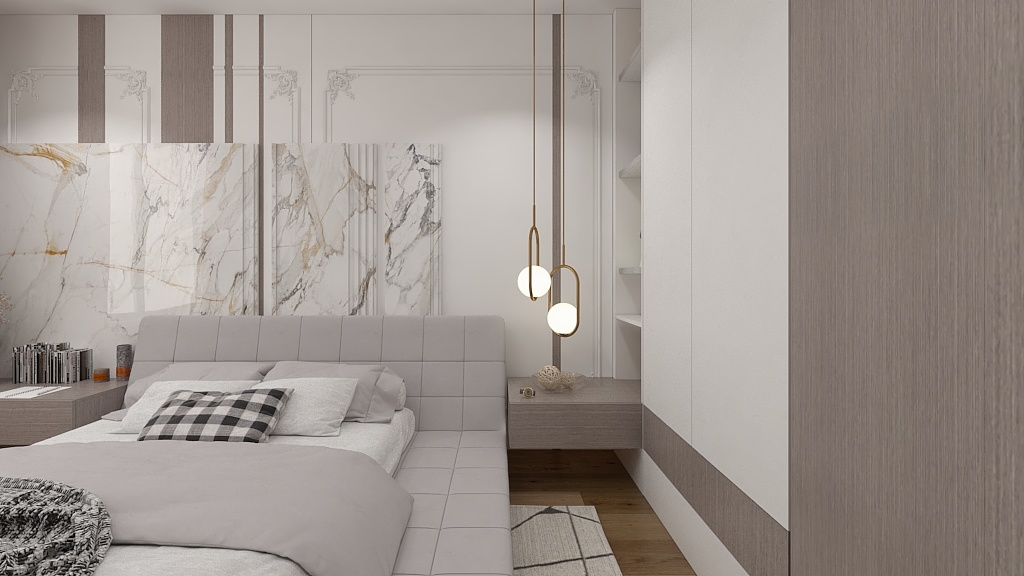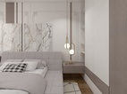 主臥同樣采用無主燈設(shè)計,留出了干凈的頂面,氛圍燈讓室內(nèi)更加溫柔舒緩。床頭背景墻的理石背景墻,將柔美與力量融匯一體,帶來平靜舒暢的氣場,能夠撫平居住者心中的雜亂困擾。床頭燈和背景墻上的石膏花線,增加了空間質(zhì)感,讓室內(nèi)更具輕奢雅氣。