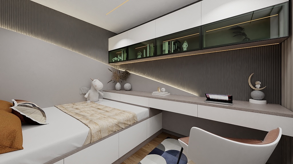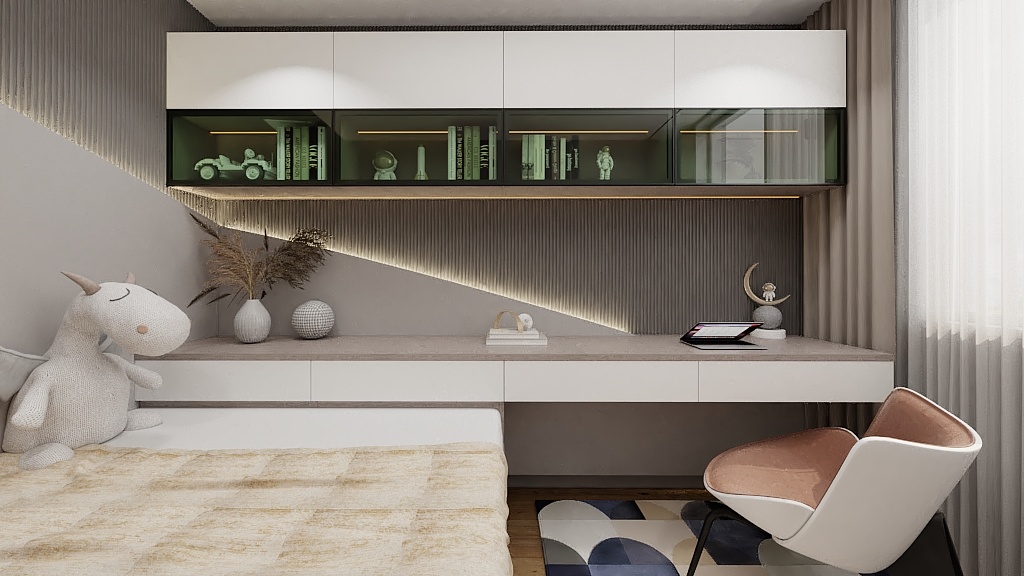 兒子房納入新空間后,室內(nèi)擁有了更多使用可能性,于是設(shè)計師增設(shè)了兒童學(xué)習(xí)區(qū),讓家中的萌娃擁有獨立的學(xué)習(xí)成長空間。