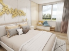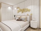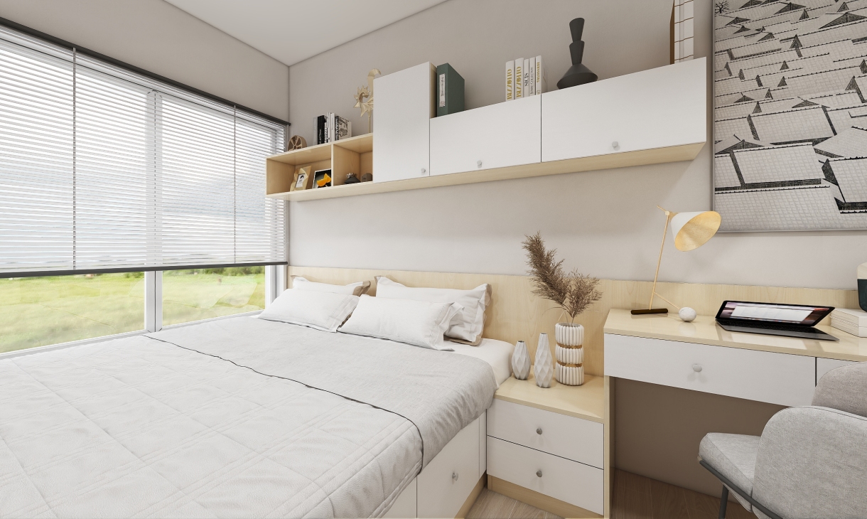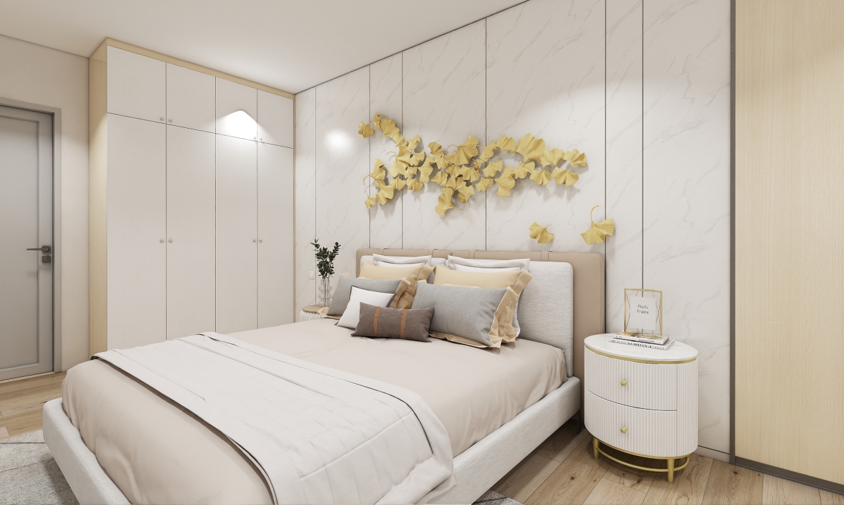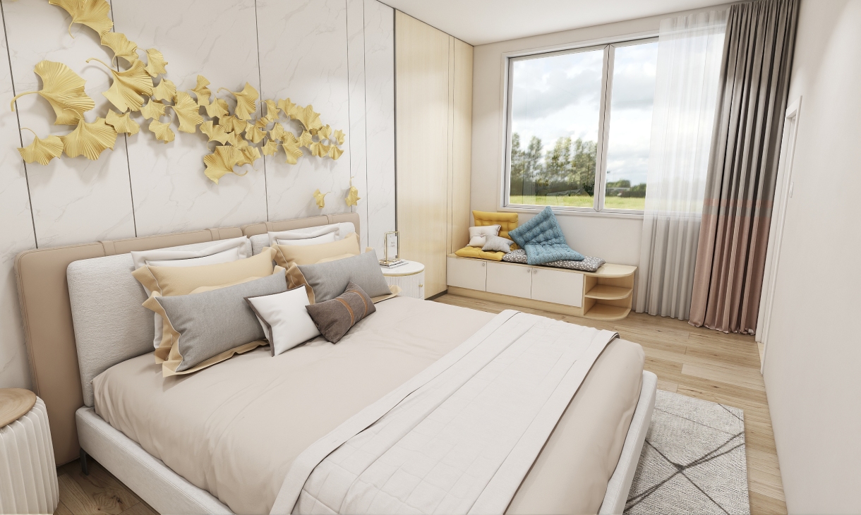 主臥設(shè)計(jì)旨在干凈舒適。奶白色的墻面搭配淺灰色窗簾,布藝軟床搭配柔軟親膚的床品。圓弧床頭柜飾以精巧的擺件,為空間增添了幾分精致,使臥室空間顯得和諧、有層次。
