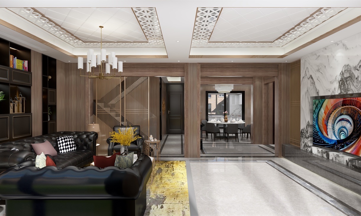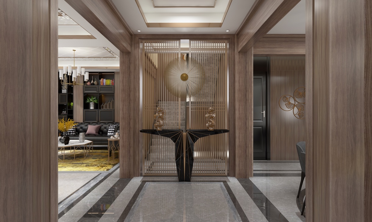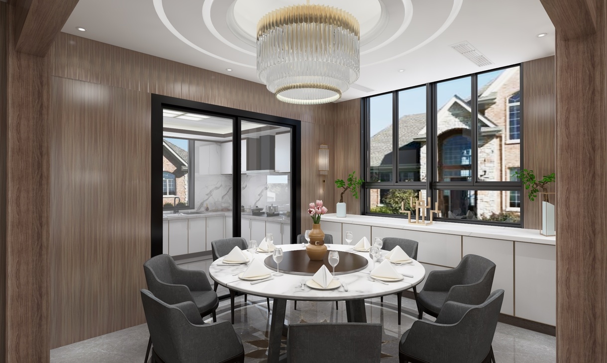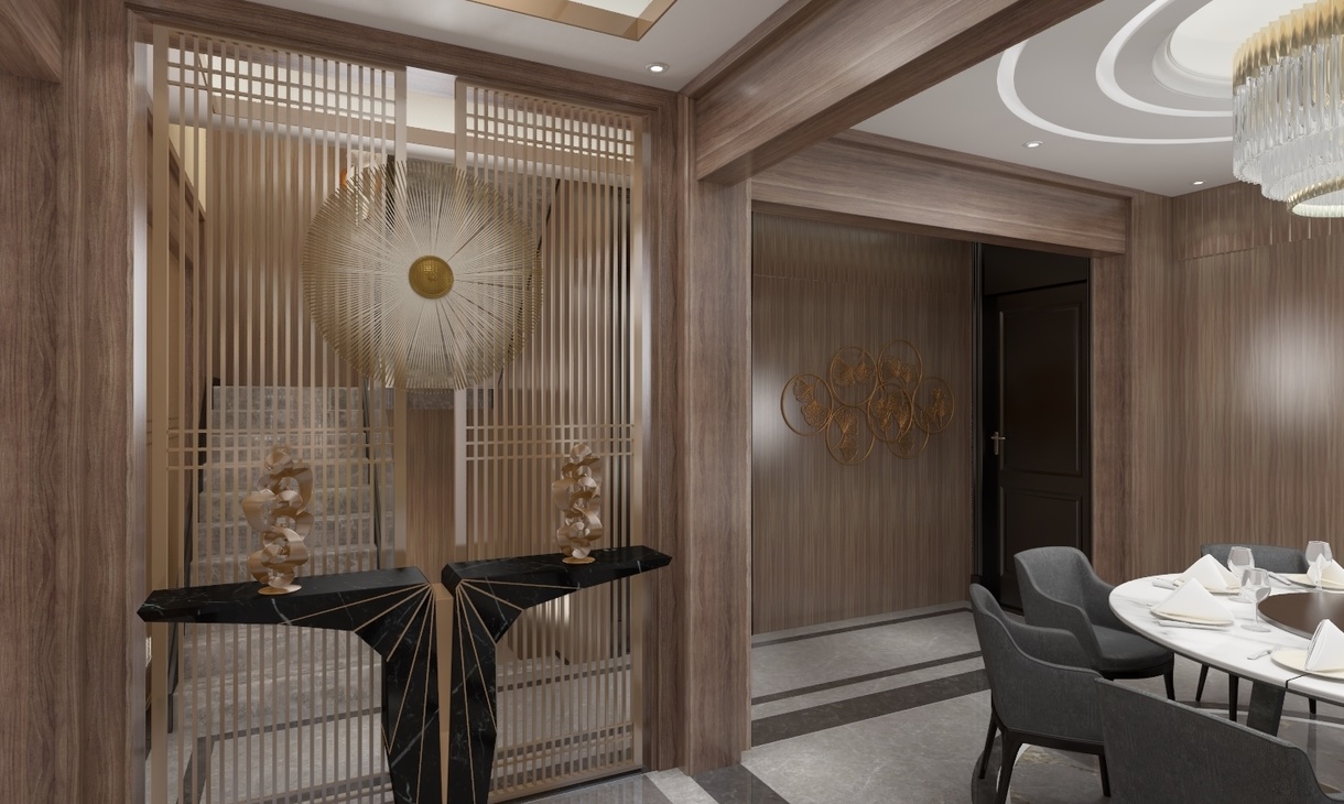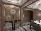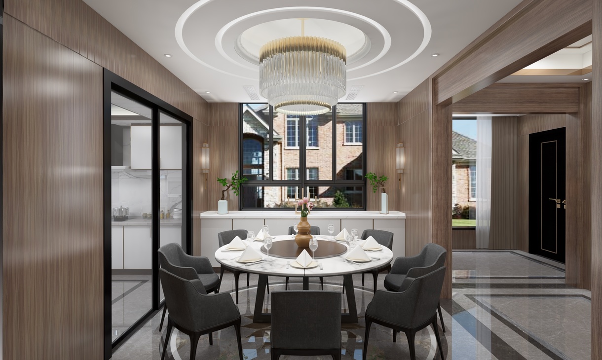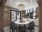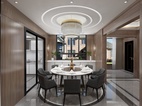 本案為室內(nèi)商住別墅小區(qū),全屋選用友邦新型材料MGRG材料,暖色金屬線條層次分明,搭配現(xiàn)代棱鏡樣式的單獨(dú)模塊。餐廳圓桌配圓頂,整體的顏色和燈光從實(shí)用到美觀由頂面詮釋在這個(gè)空間。