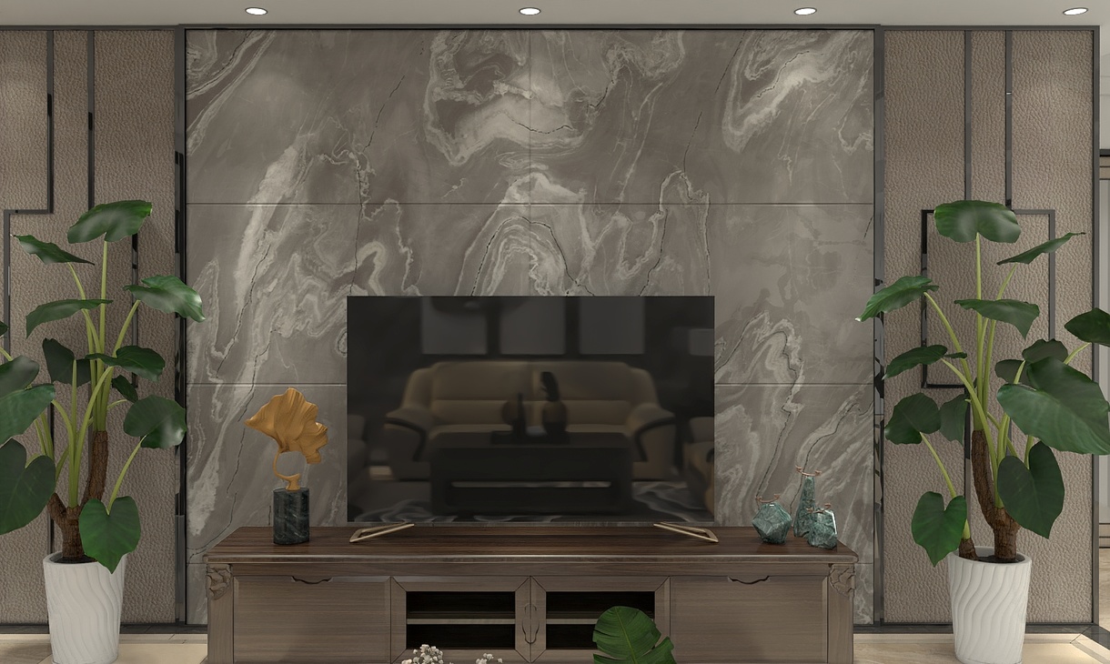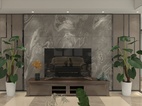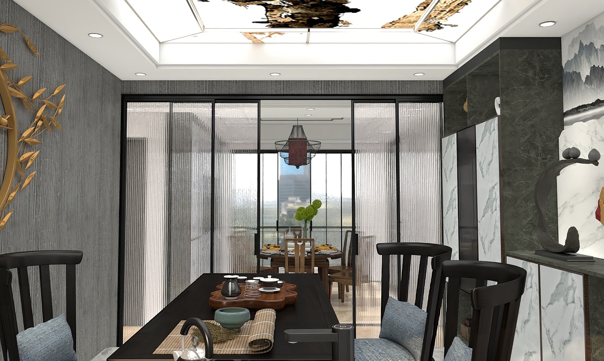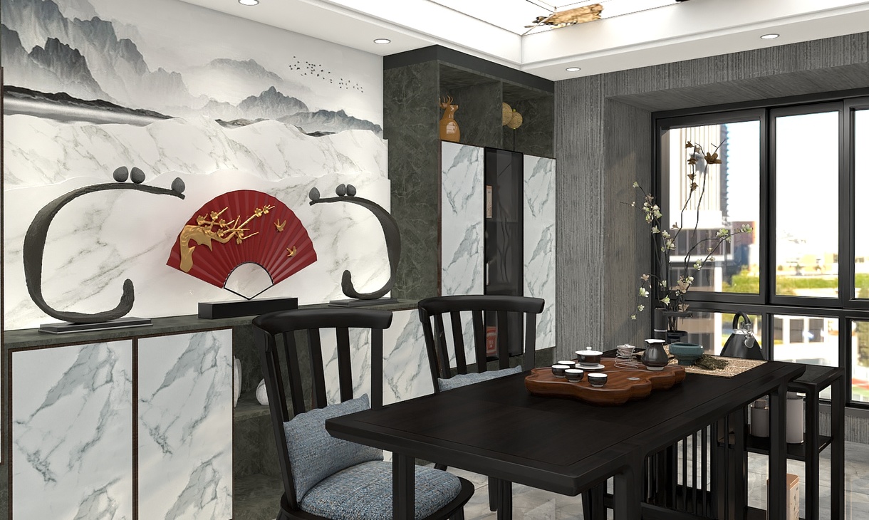萬福新城10棟03戶型新中式客餐廳,主要使用黑灰土黃的色彩搭配