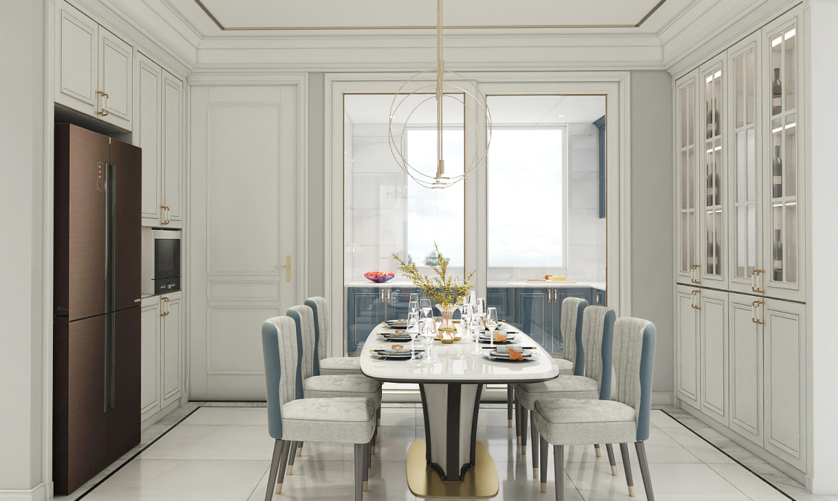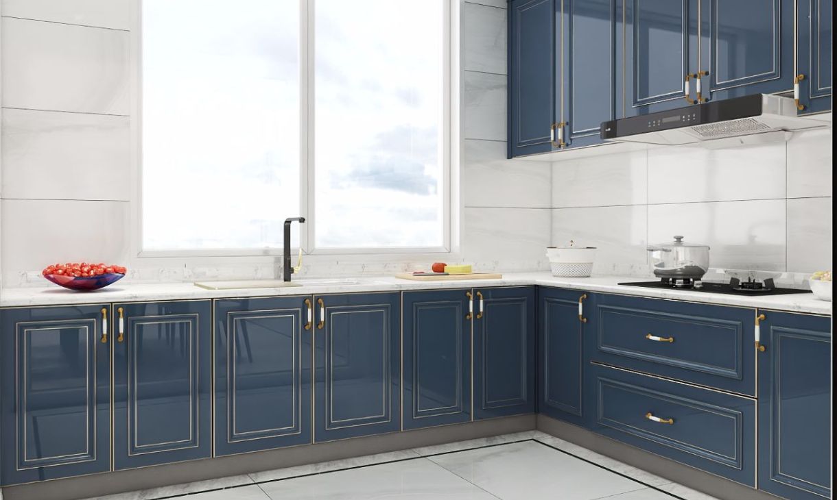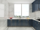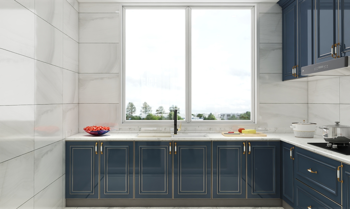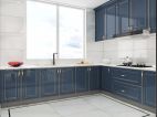廚房采用藍(lán)色烤漆面與白色墻磚結(jié)合白,相得益彰
