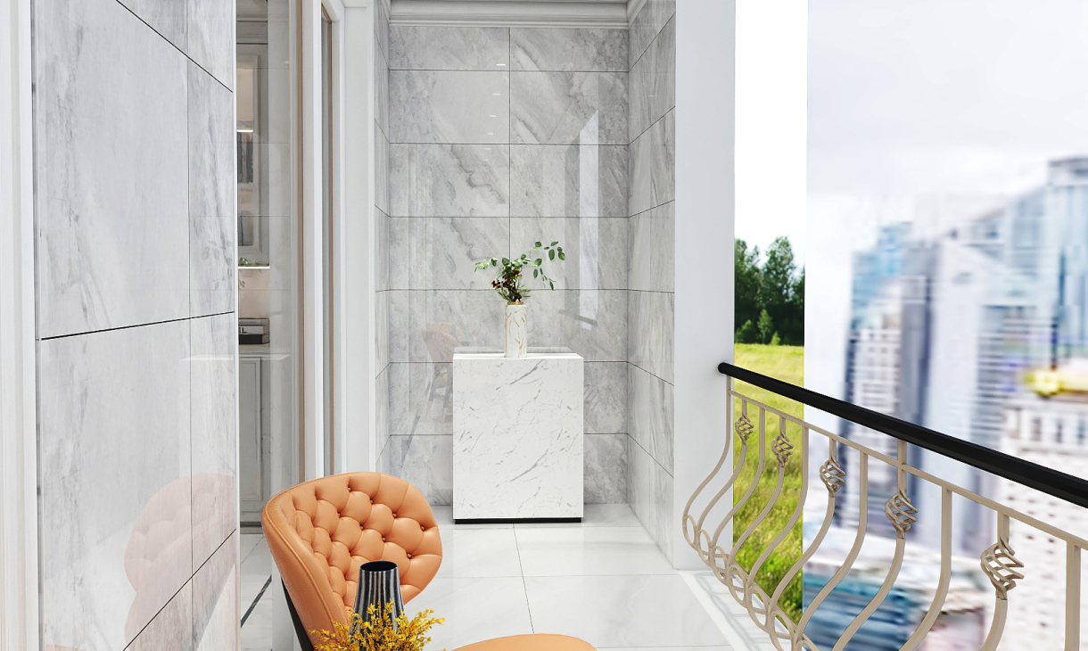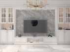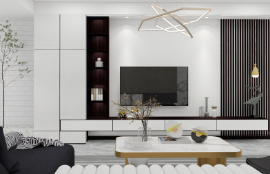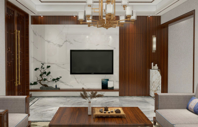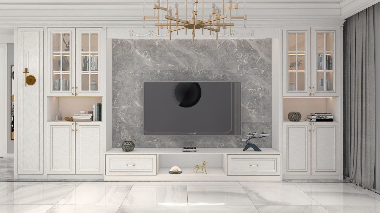 地面采用白色大理石瓷磚,電視墻酒柜埡口做整體處理