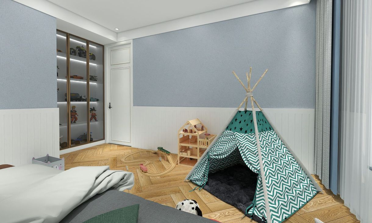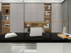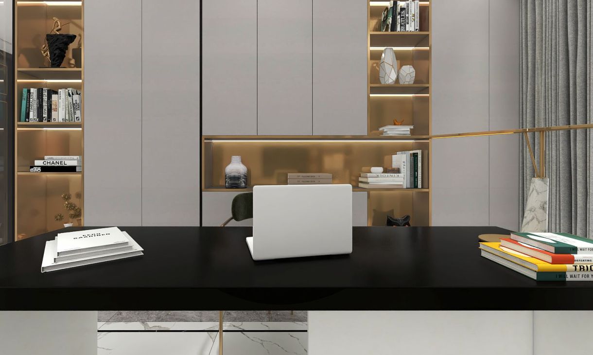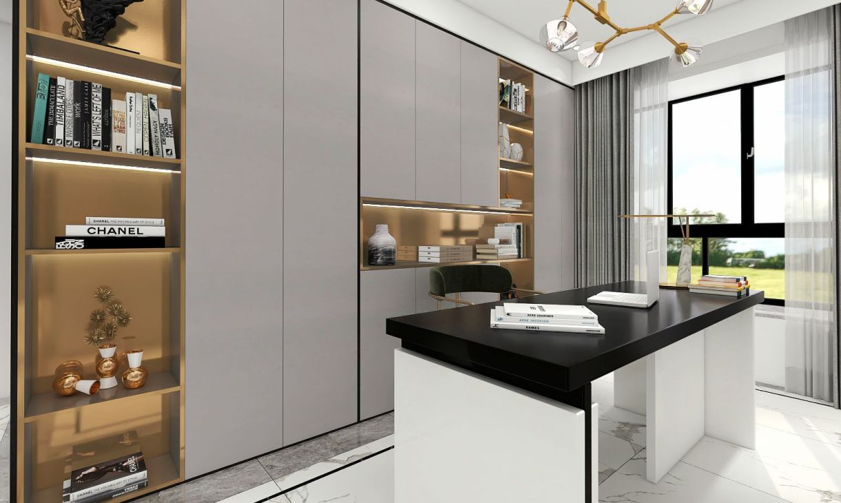 進(jìn)入書房,書柜隱喻書中自有黃金屋,黑色的書桌面給人以深沉與遐想,黑白的配色讓人舒適、安靜